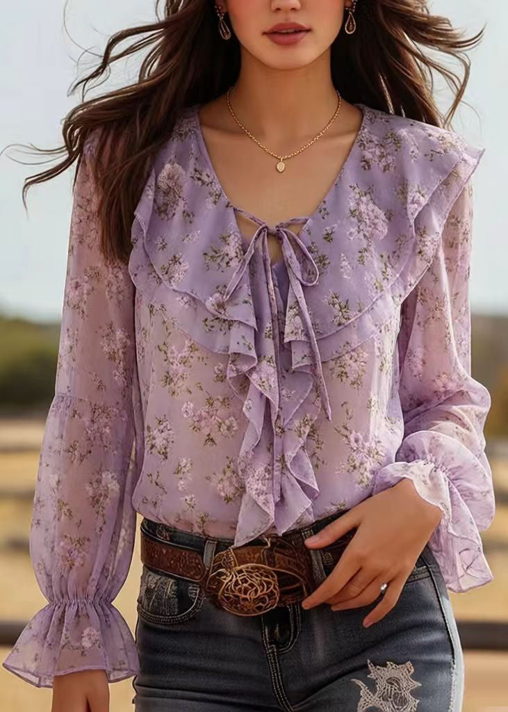 Italian Lavender Ruffled Print Chiffon Shirts Spring
