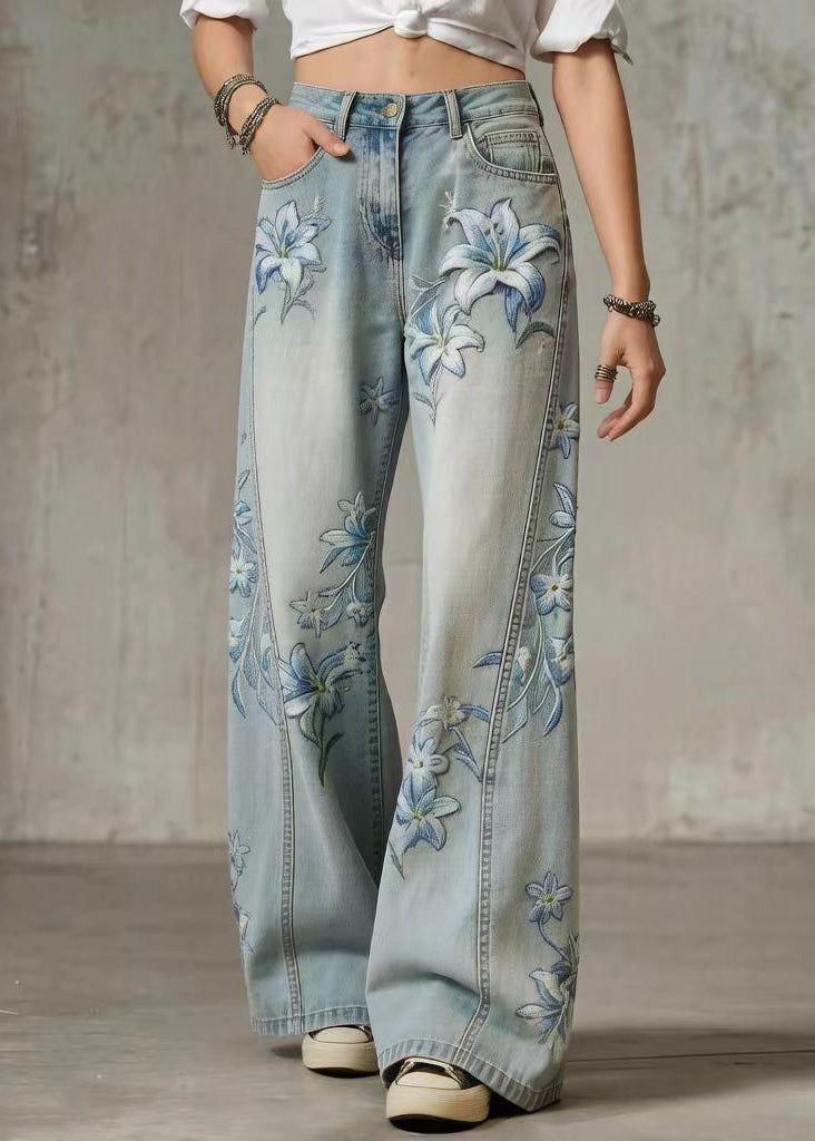 Style Blue High Waist Print Denim Straight Pants Spring