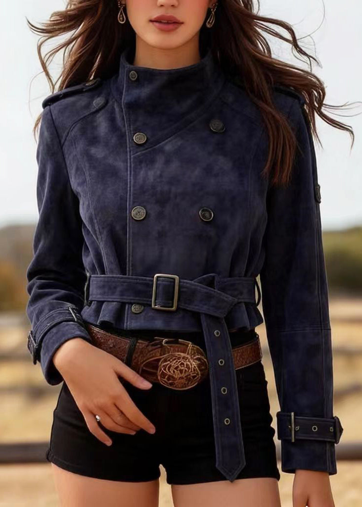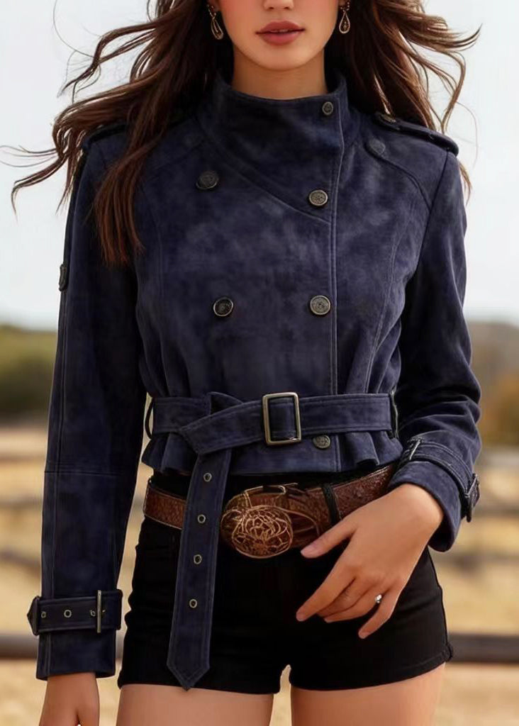 Casual Navy Double Breast Faux Suede Tunic Coats Spring
