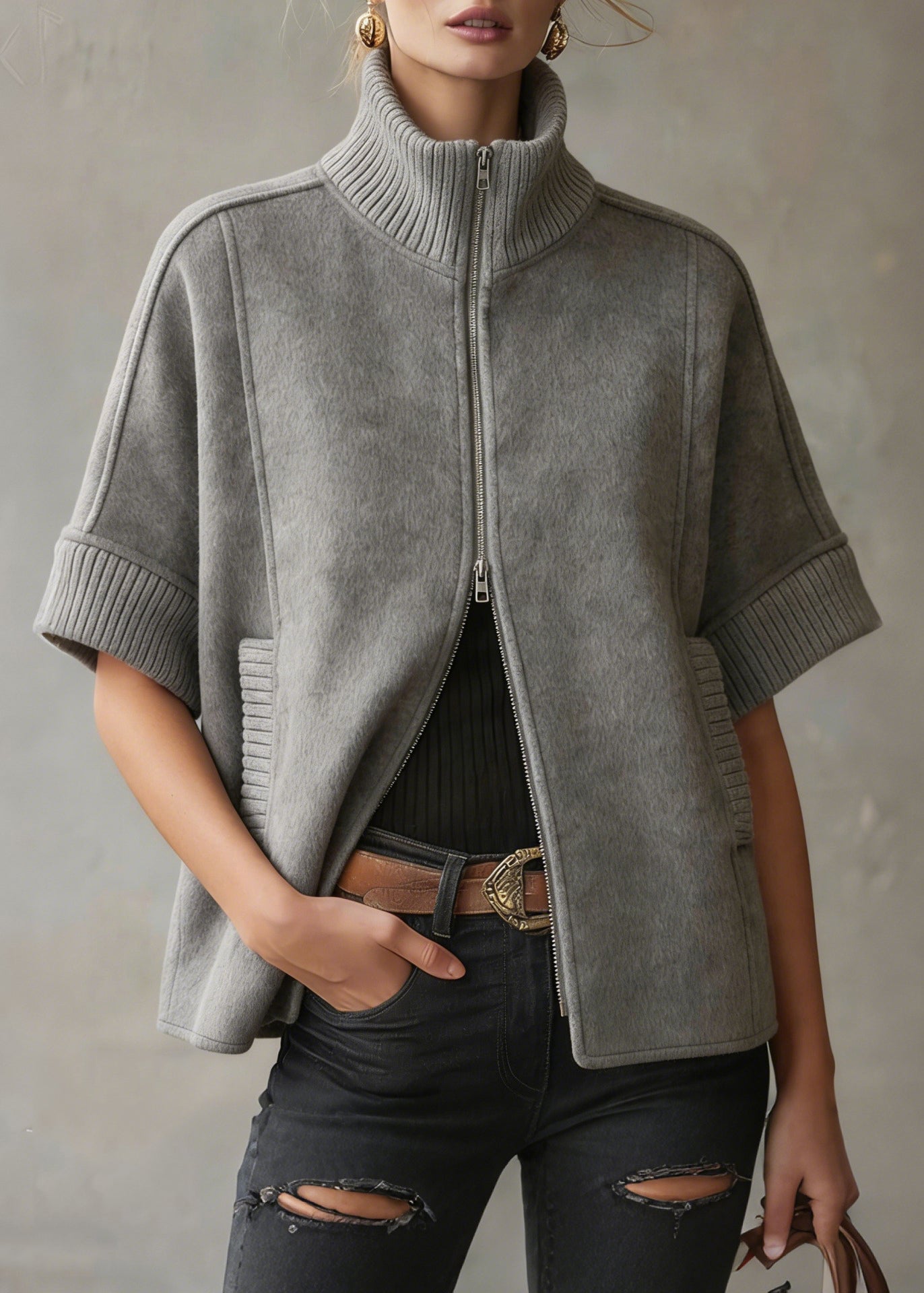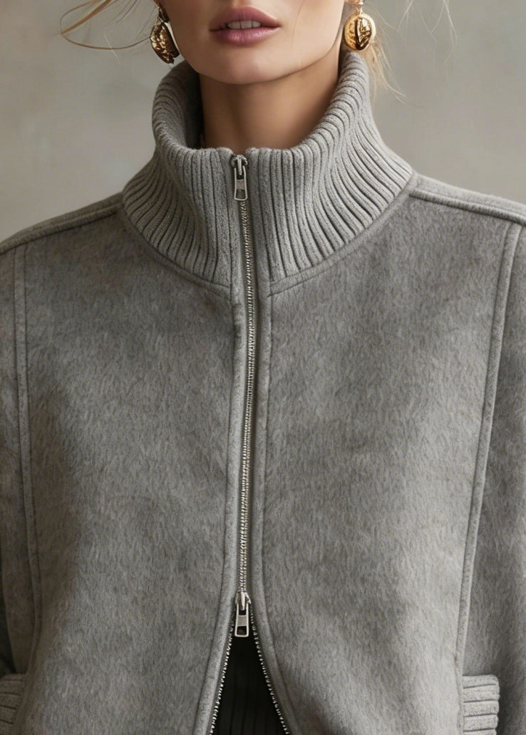 Chic Grey Zip Up Patchwork Woolen Coats Short Sleeve