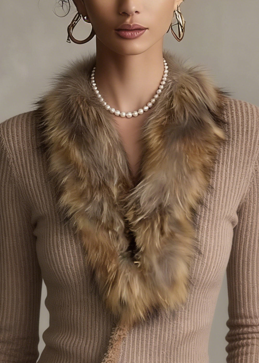 Italian Khaki Faux Fur Collar Patchwork Knit Jackets Winter