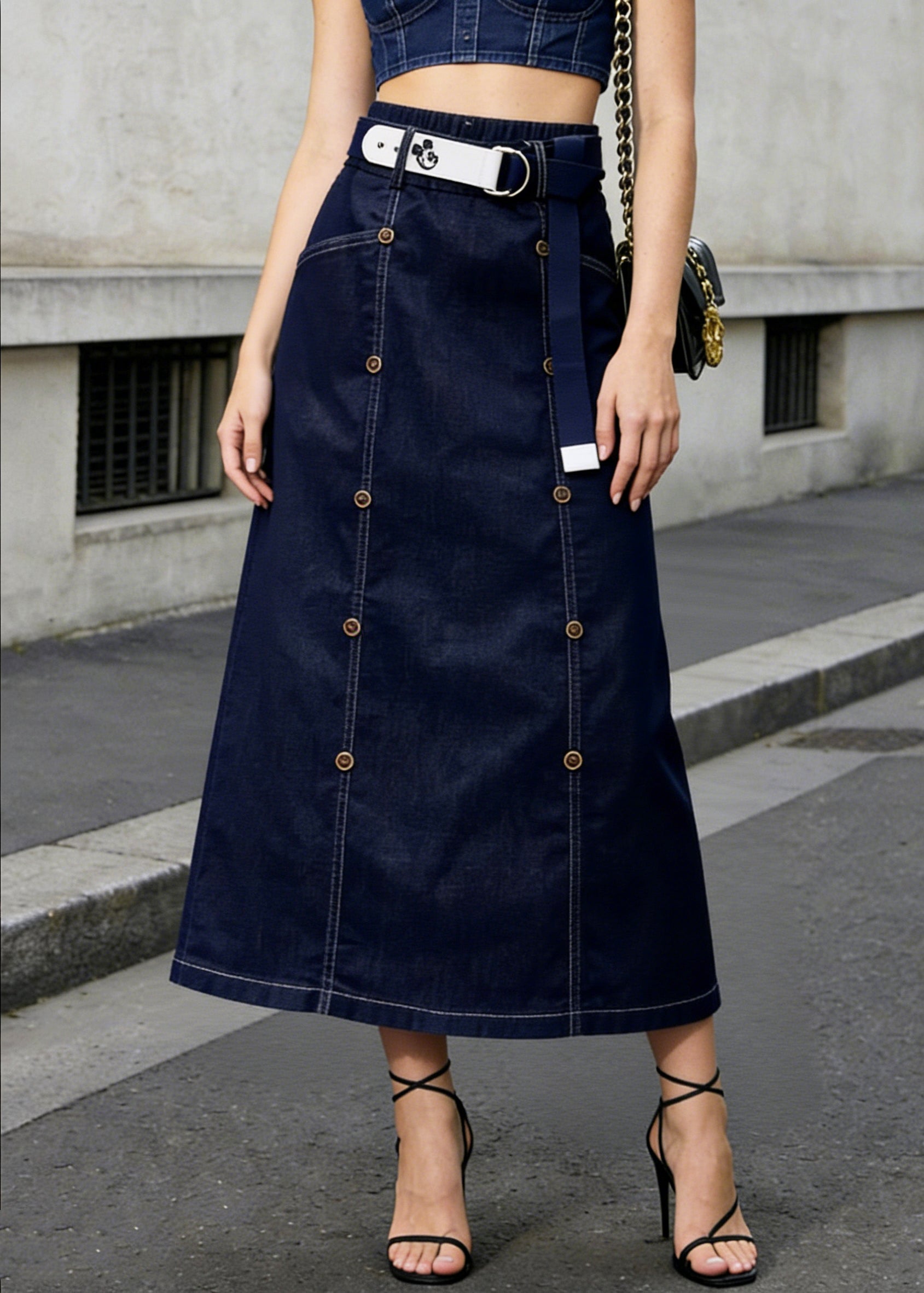 Modern Navy Double Breast Denim A Line Skirt Summer