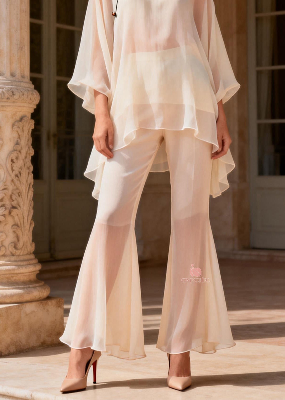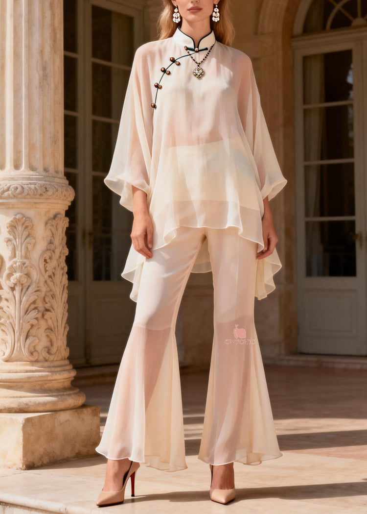 Plus Size Mandarin Collar Top And Pants Silk Two Piece Set Summer