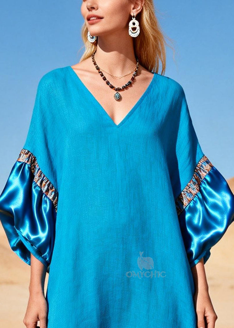 Casual Sea Blue V Neck Patchwork Cotton Maxi Dress Lantern Sleeve