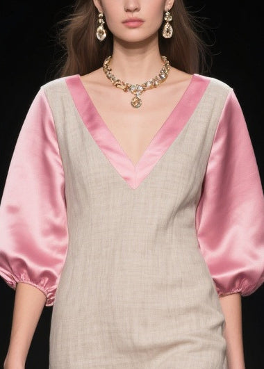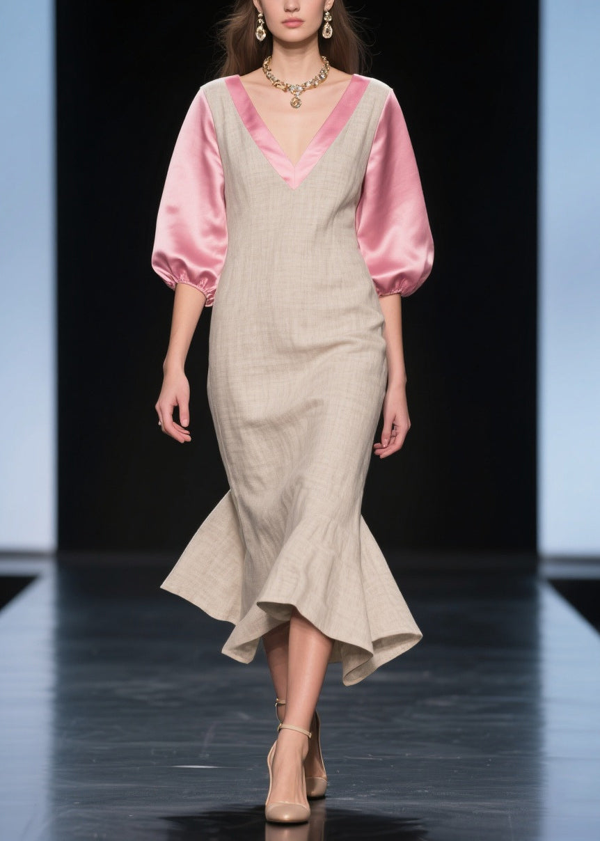 Beautiful Beige Puff Sleeve Patchwork Linen Silk Maxi Dress Summer