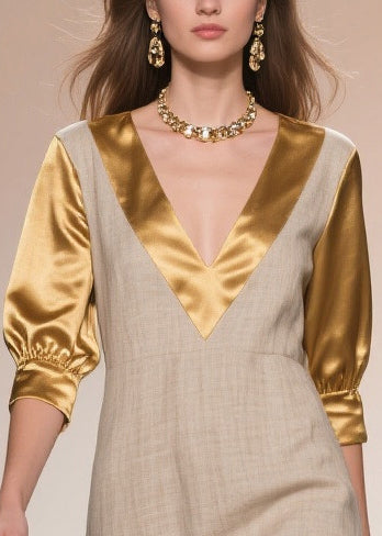 Beige Patchwork Linen Silk Fake Two Piece Dress Ruffles Summer