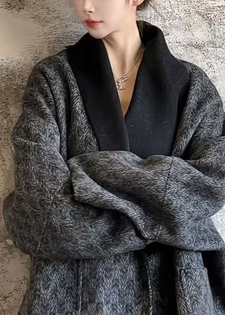 Fashion Dark Grey V Neck Print Pockets Wool Coats Fall