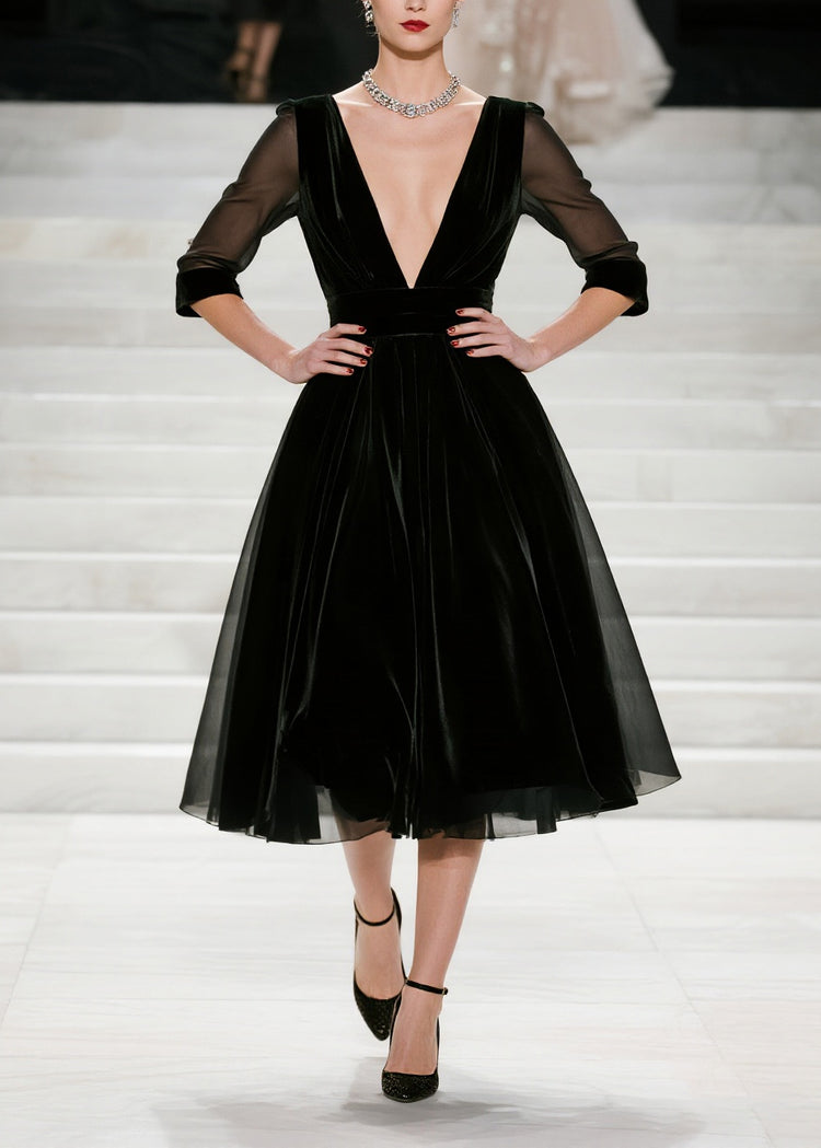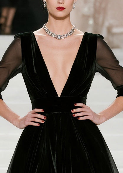 French Black Deep-V Neck Patchwork Silk Velvet Vacation Dresses Summer