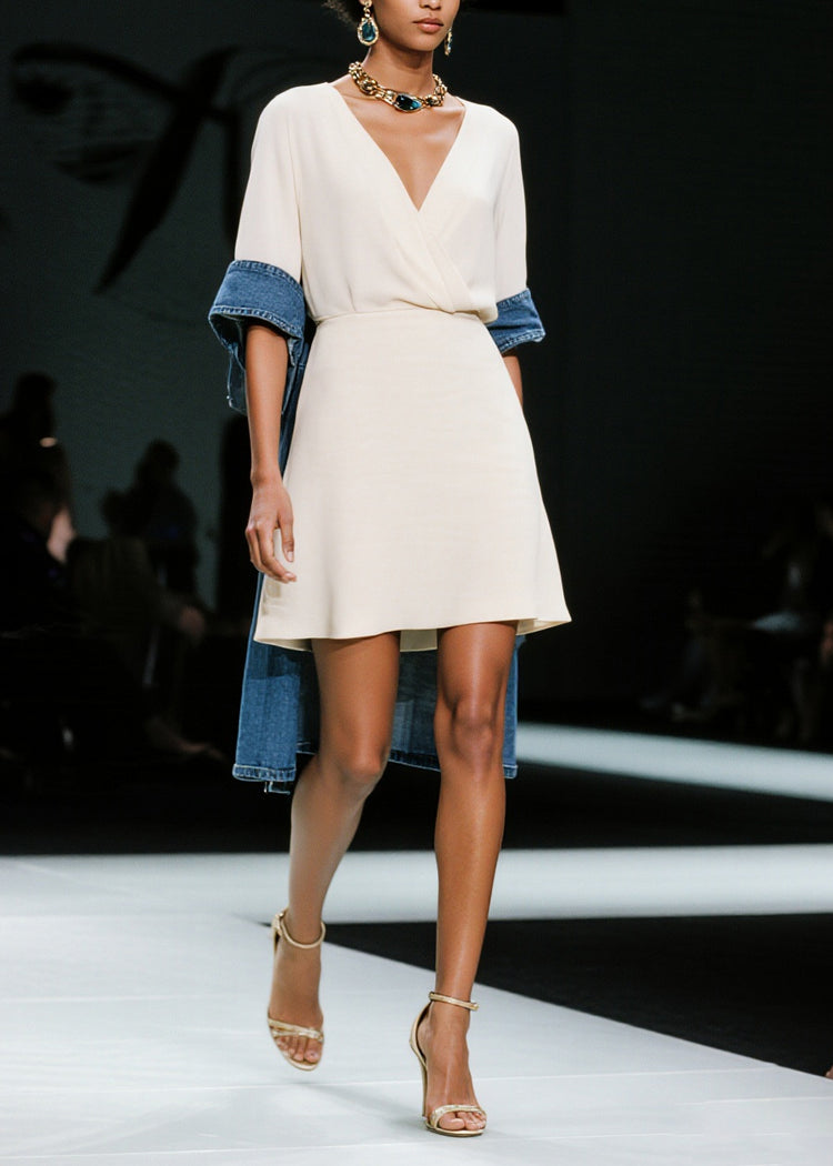 Simple White V Neck Patchwork Denim Mid Dress Summer