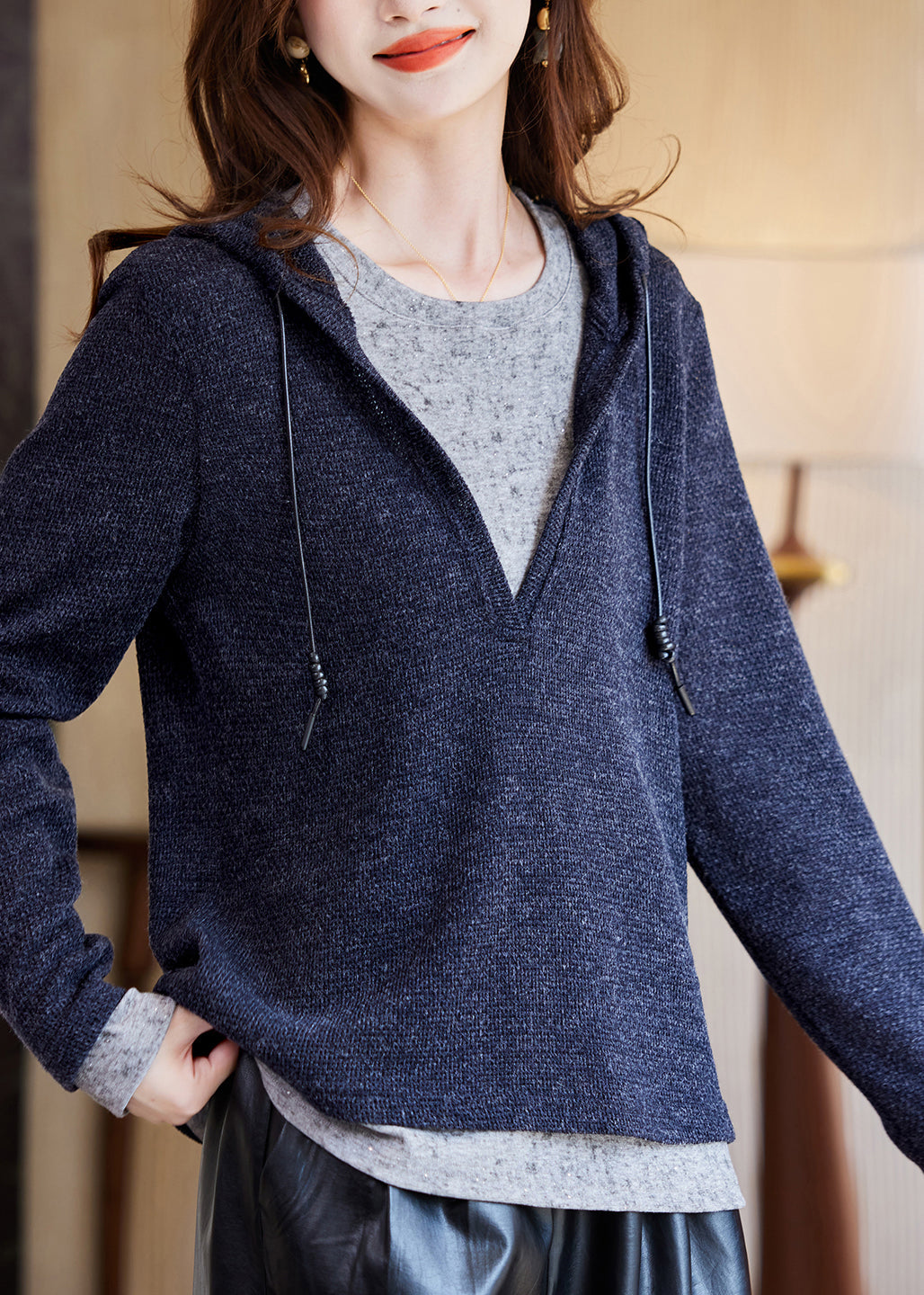 Brief Navy Blue Drawstring Patchwork Knit Cotton Hooded Top Fall