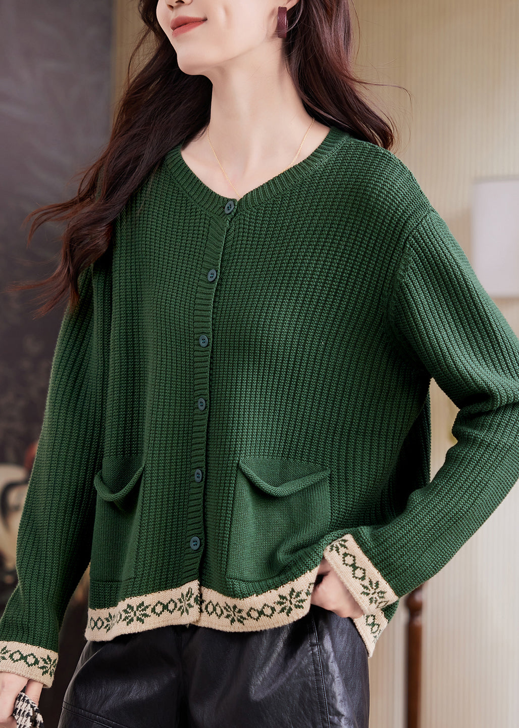French Green Patchwork Button Cotton Knit Cardigan Flare Sleeve