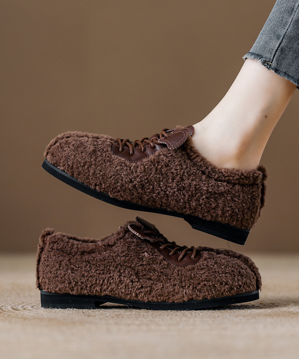Camel Suede Lace Up Splicing Loafers Fuzzy Wool Lined