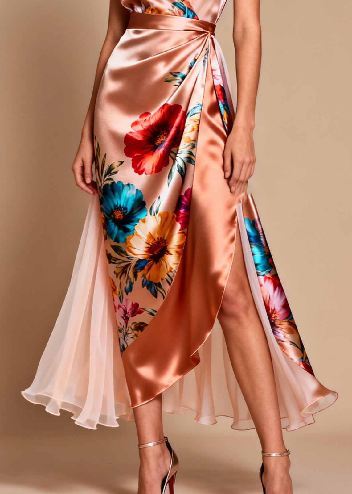 Beautiful Apricot Print Patchwork Side Open Chiffon Evening Dress Summer