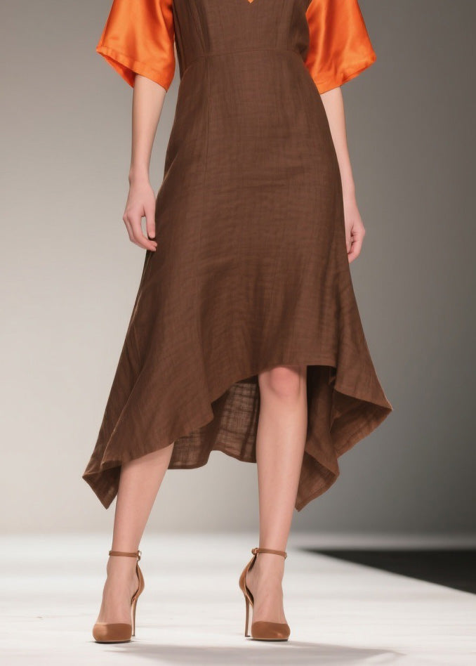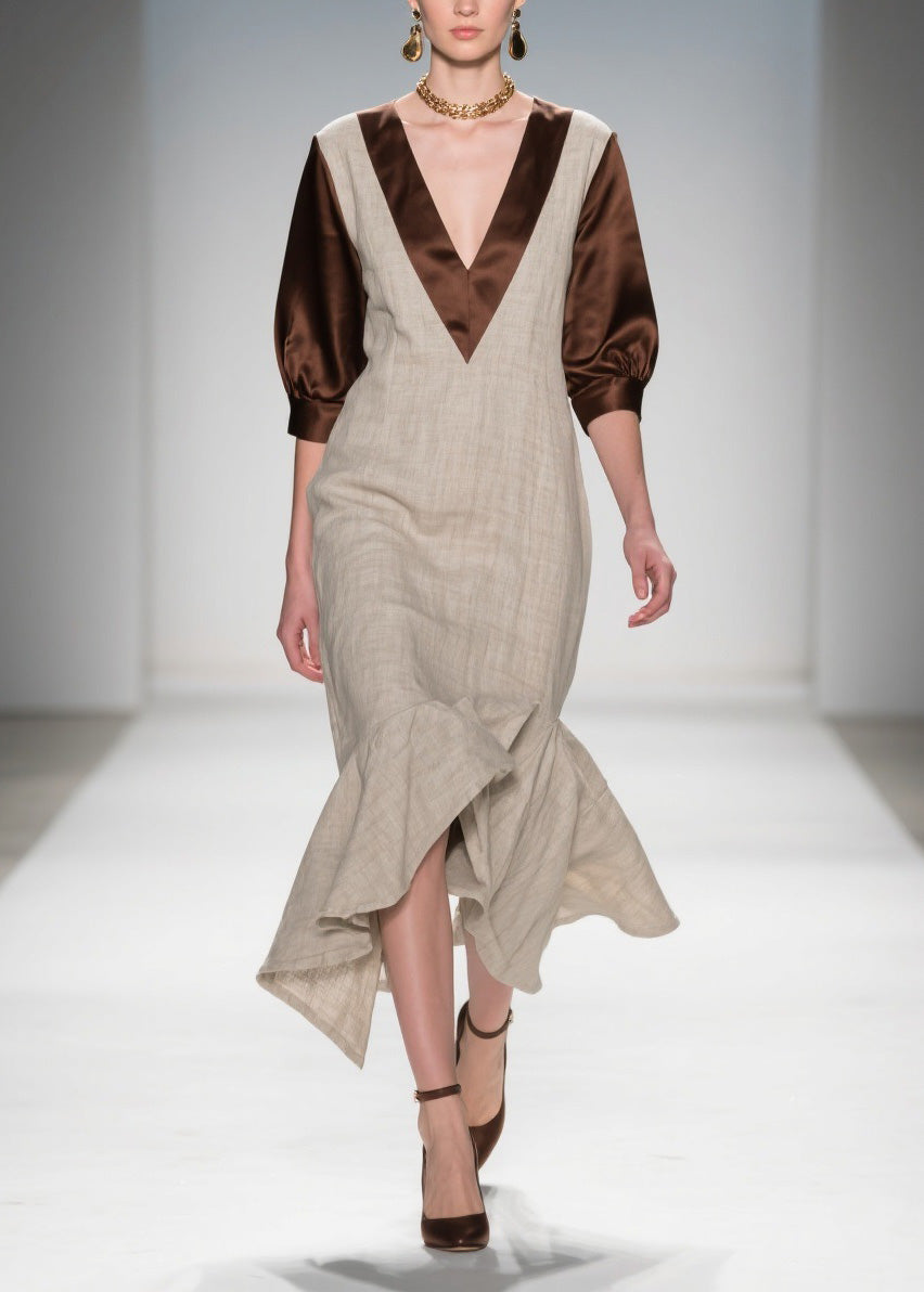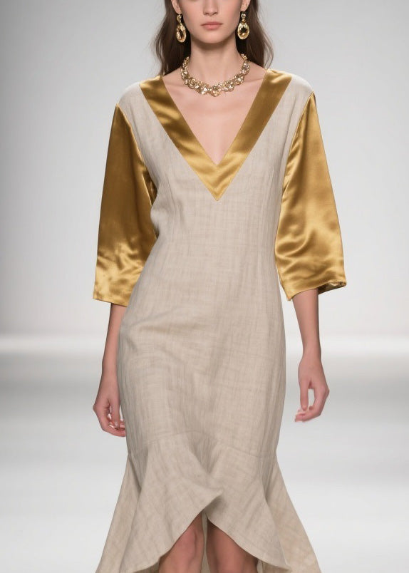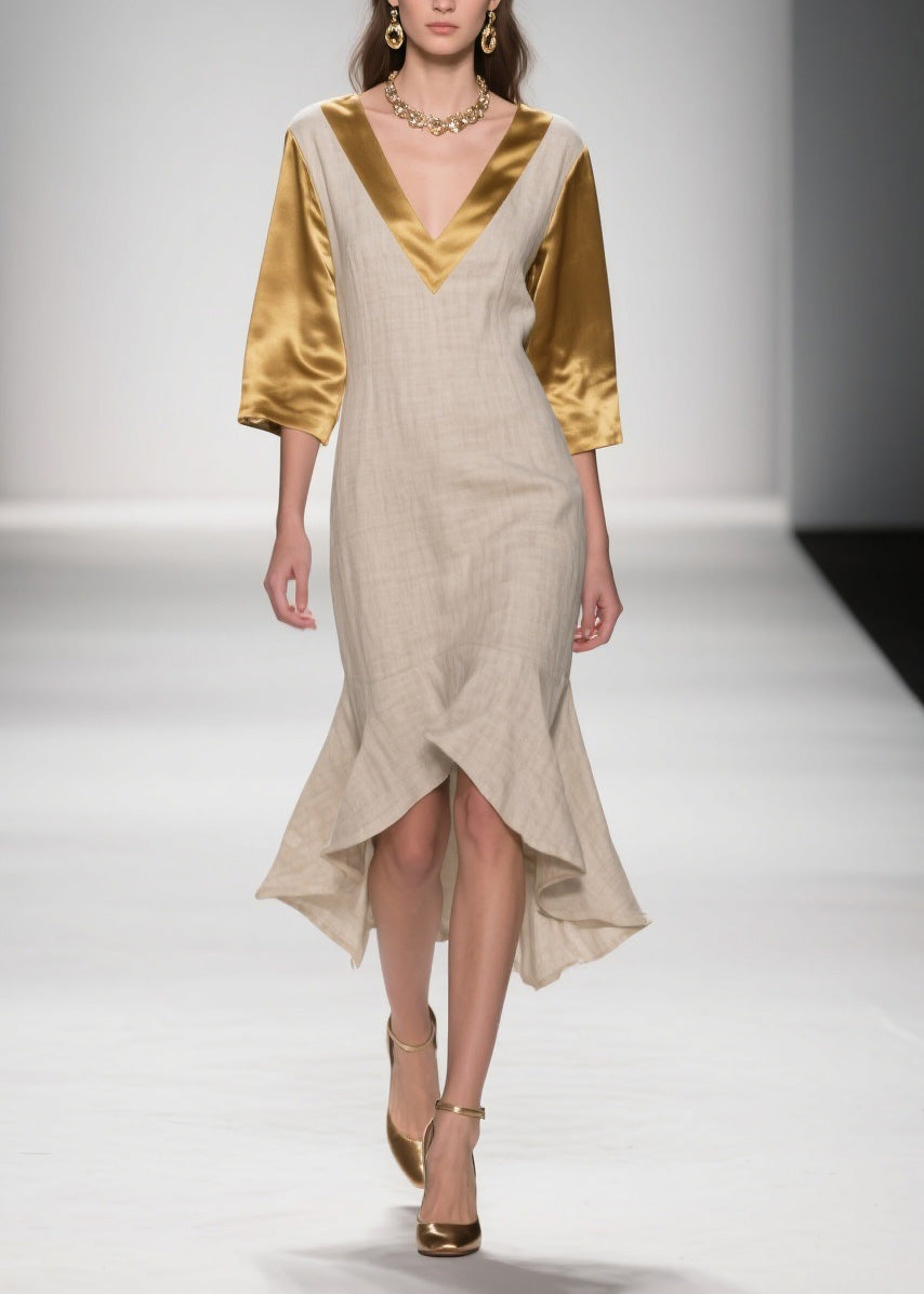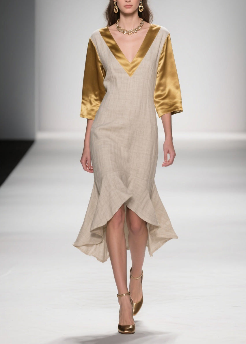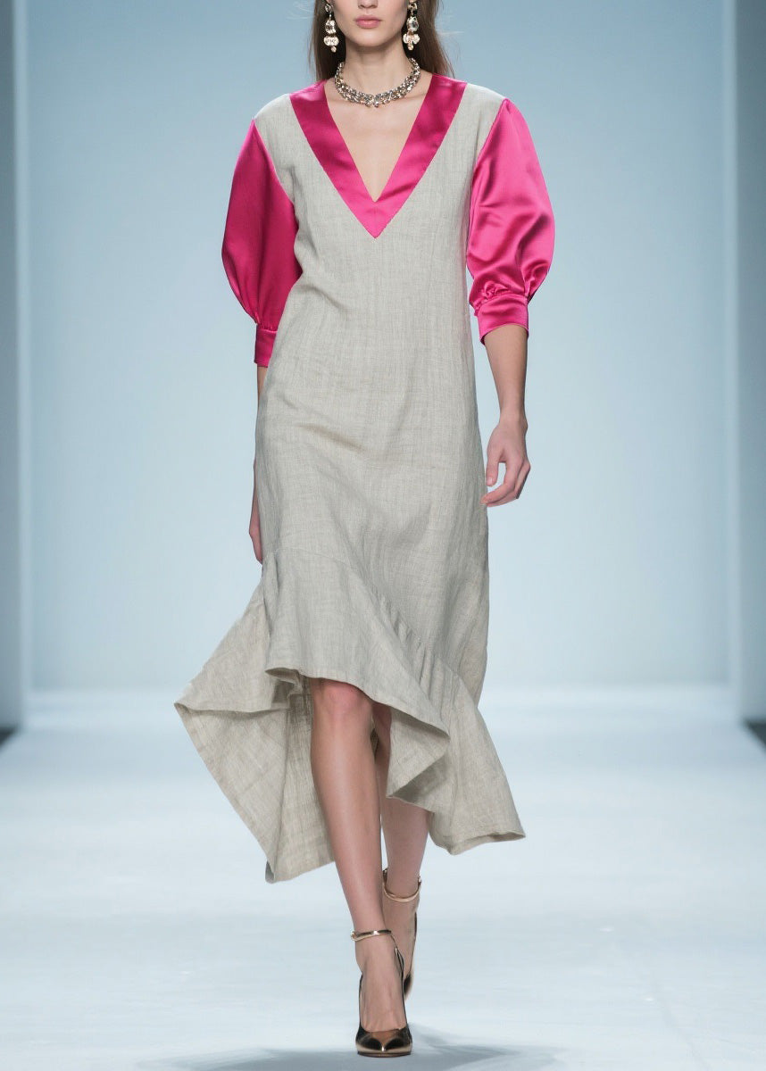 French V Neck Asymmetrical Patchwork Linen Silk Dresses Summer