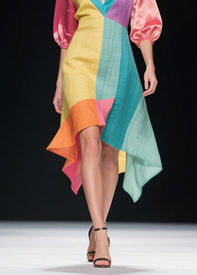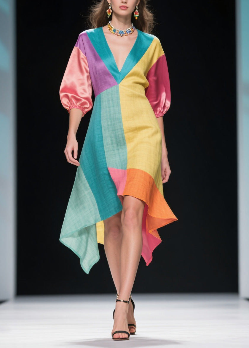 Unique Colorblock V Neck Patchwork Linen Silk Dresses Summer