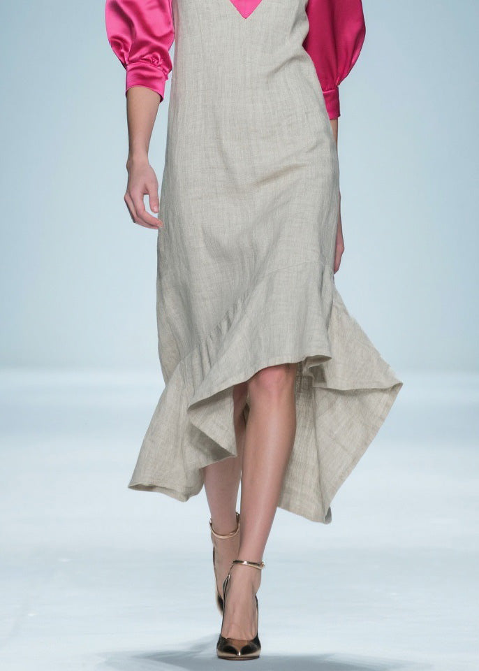 French Ruffled Asymmetrical Patchwork Linen Silk Dress Summer