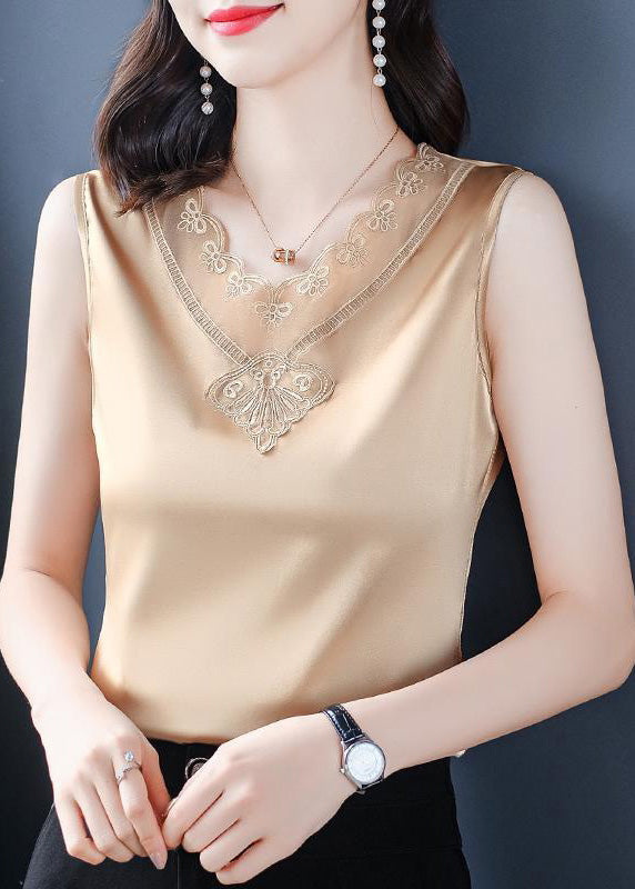 French Black V Neck Tulle Patchwork Silk Vests Summer