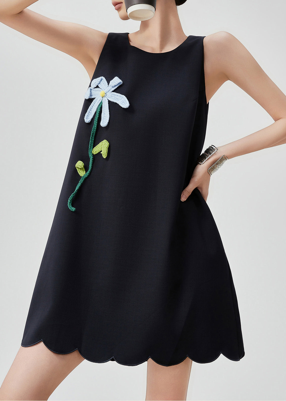 Stylish Black O-Neck Floral Mid Dress Sleeveless