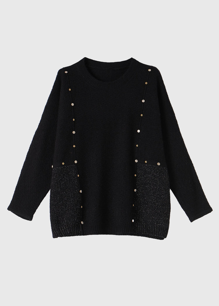 French Black O-Neck Patchwork Cozy Cotton Knit Sweater Winter