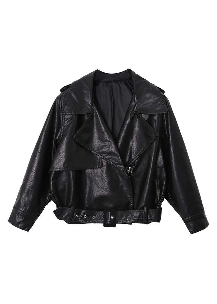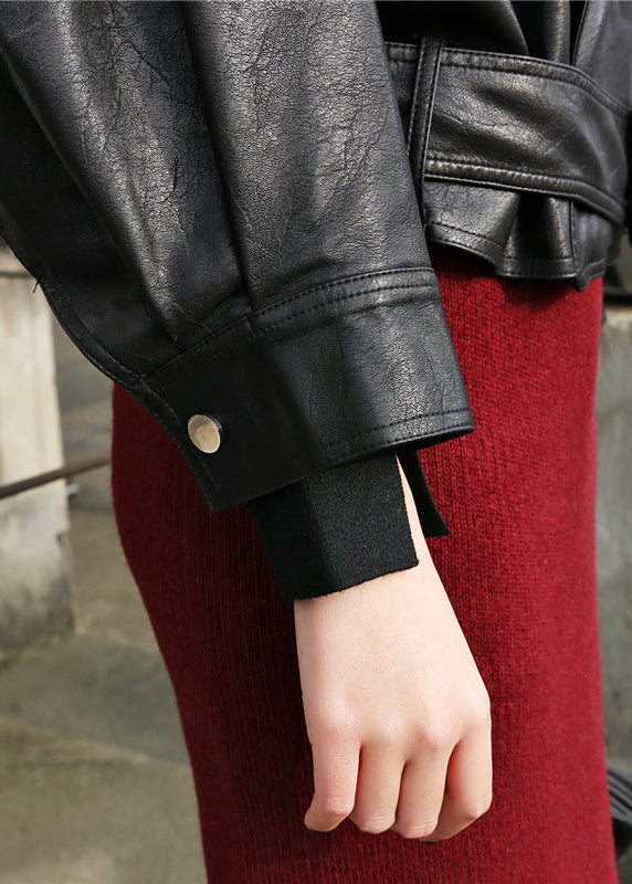 French Black Peter Pan Collar Zippered Patchwork Faux Leather Coat Fall