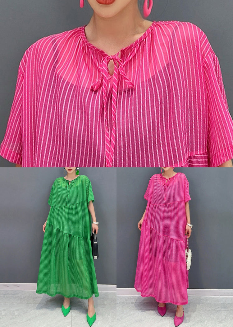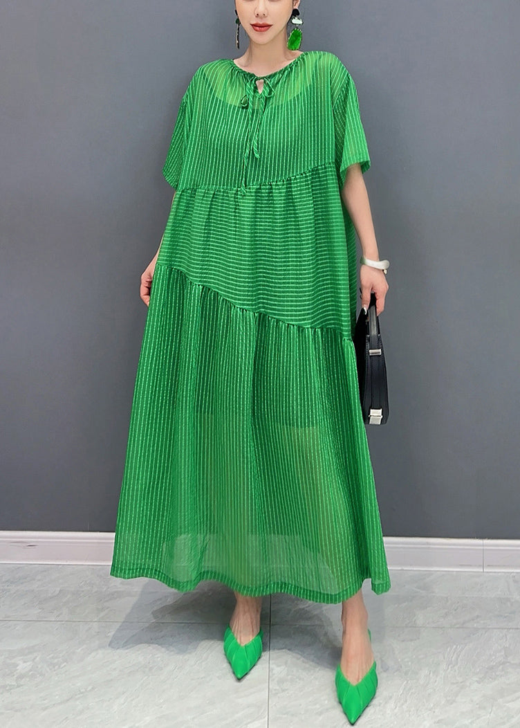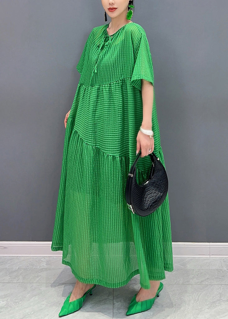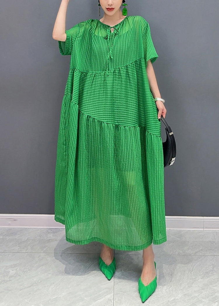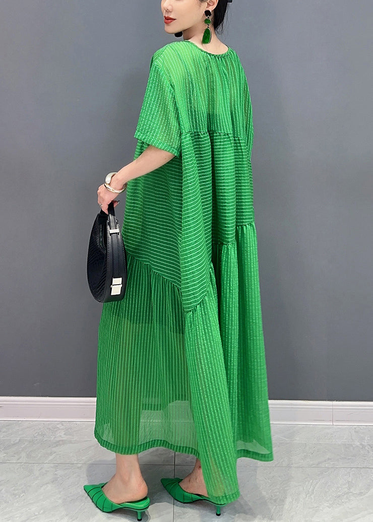 Green Striped Patchwork Cotton Long Dresses Pockets Short Sleeve