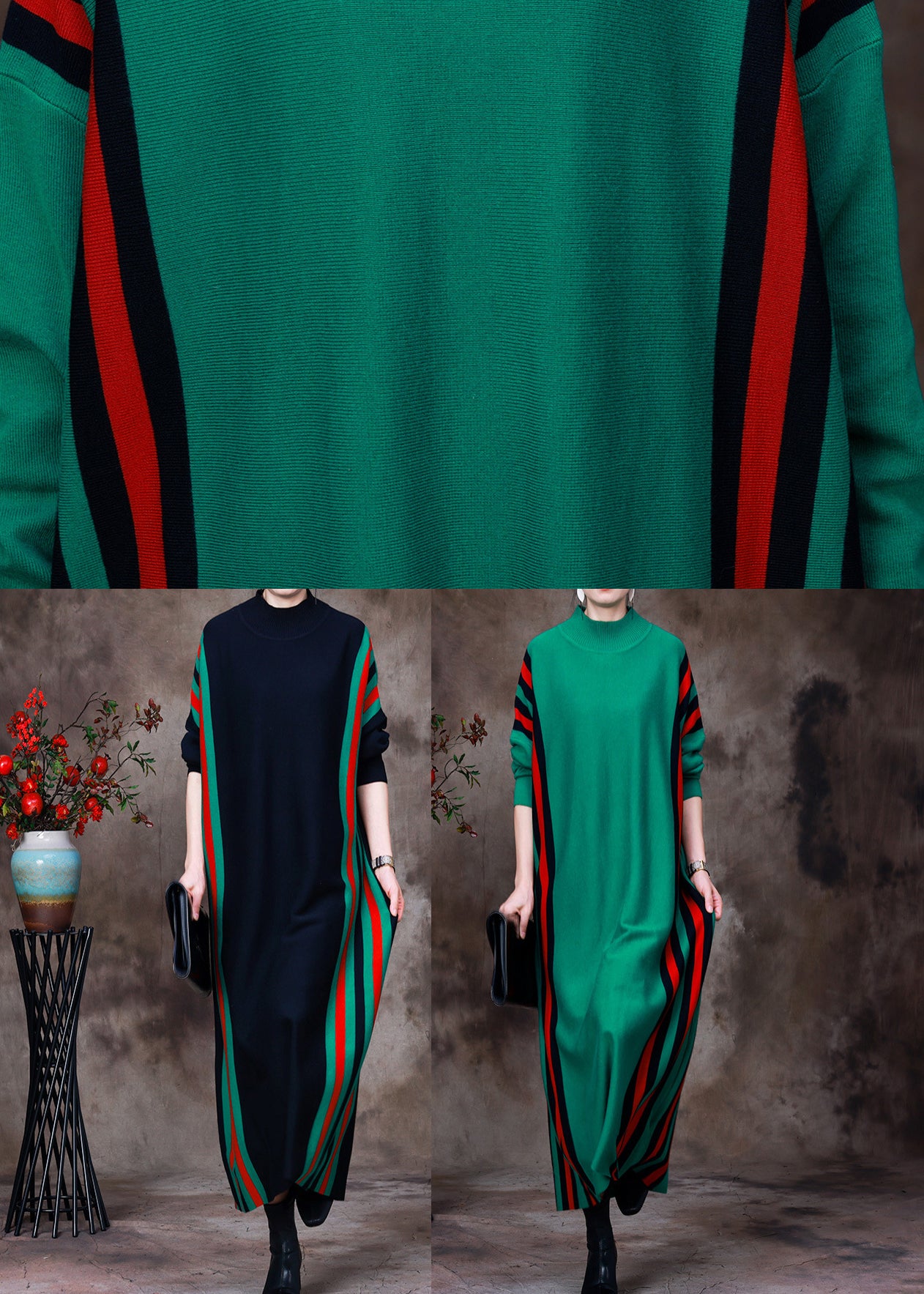 Green Turtleneck Striped Patchwork Knit Long Sweater Dress Long Sleeve