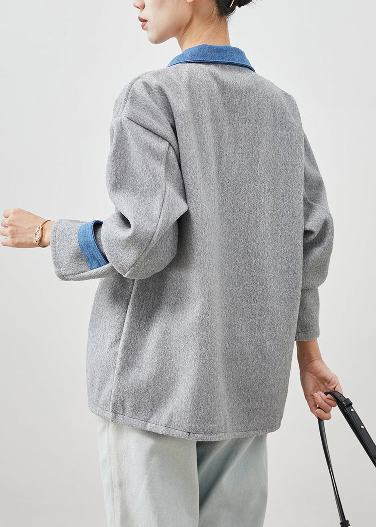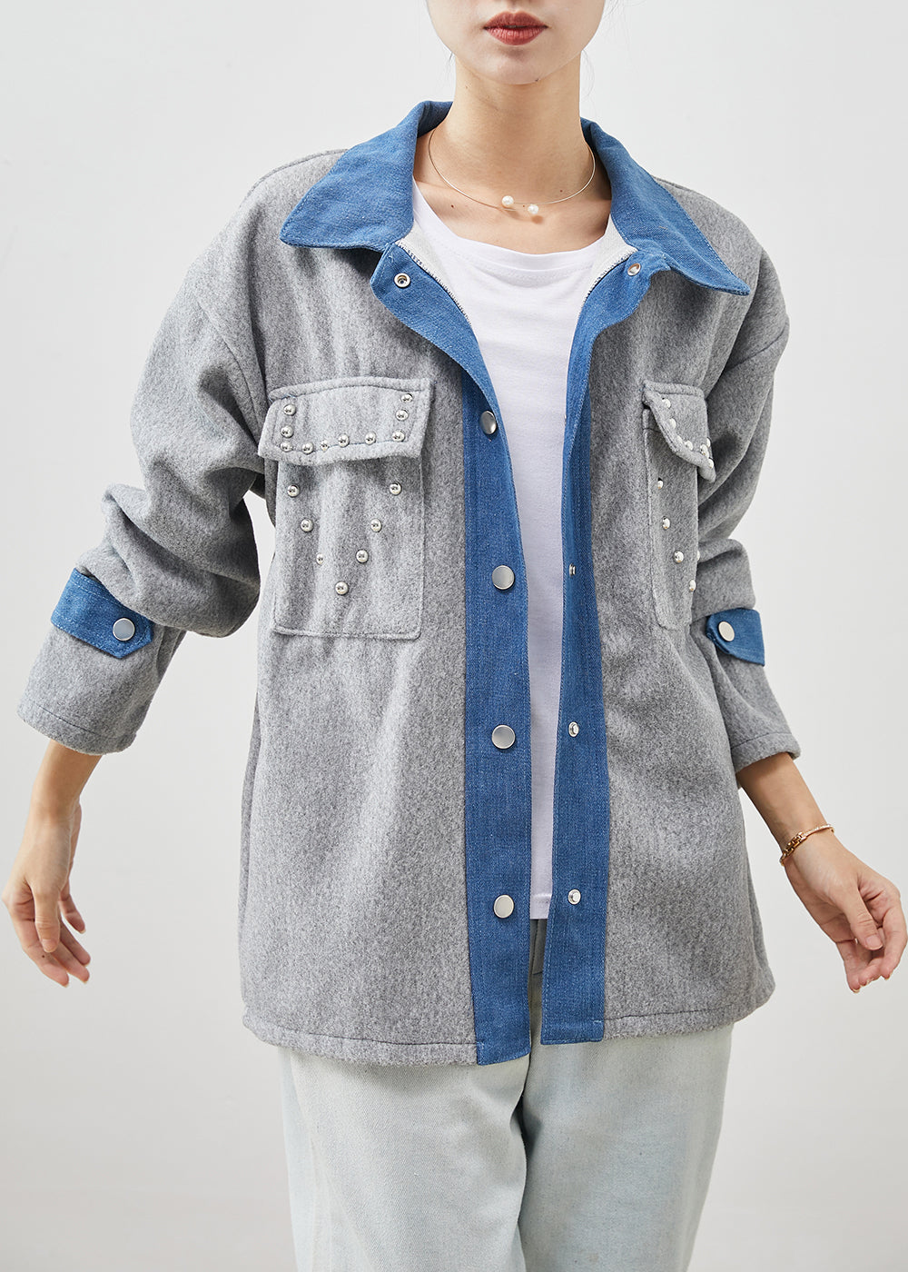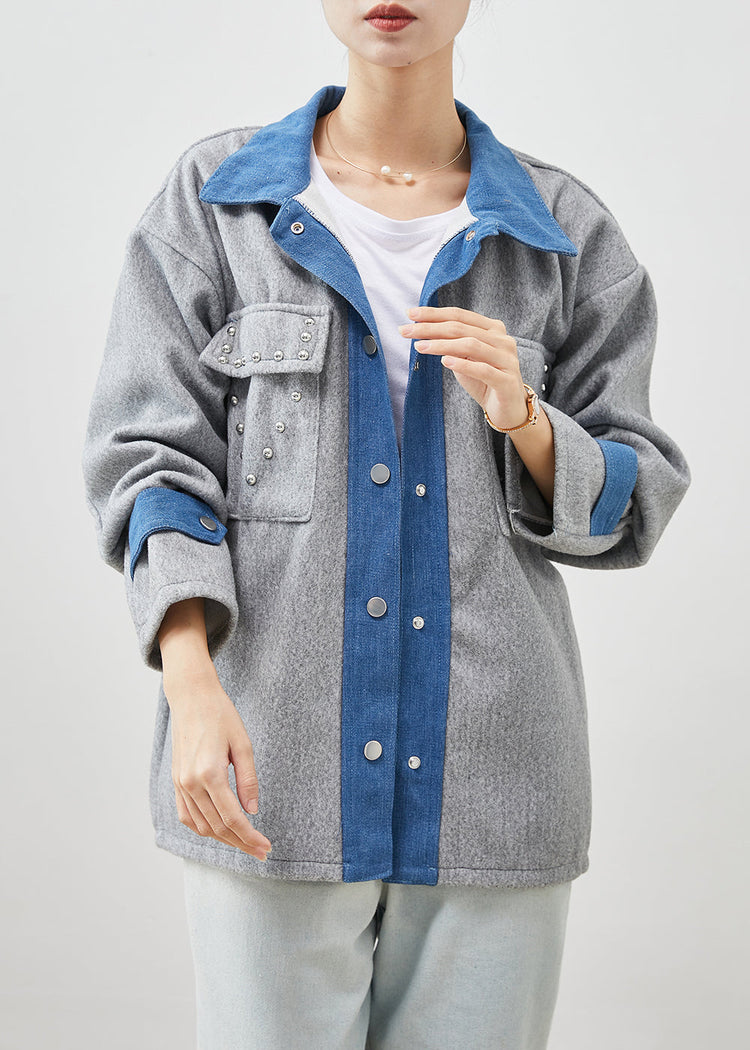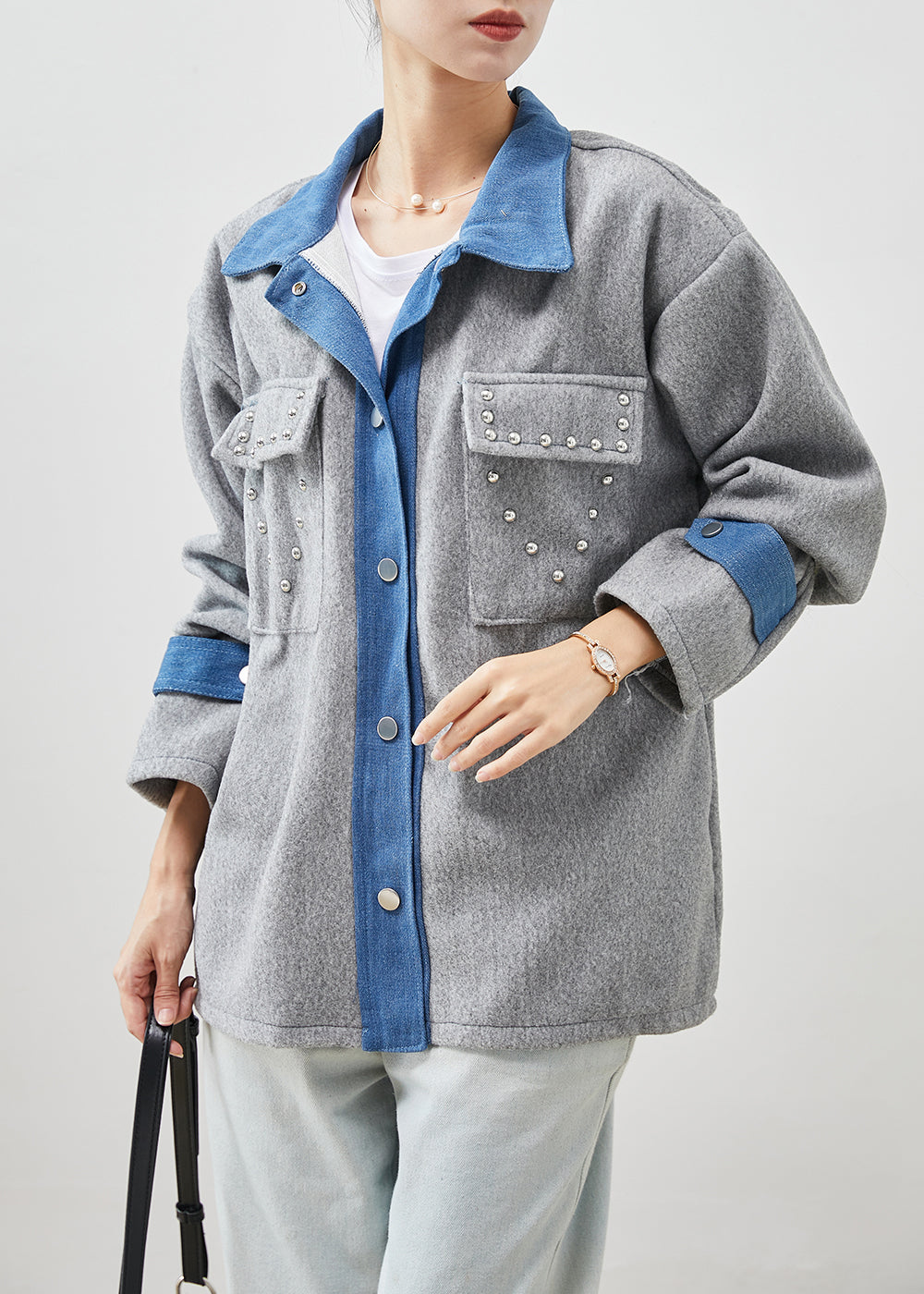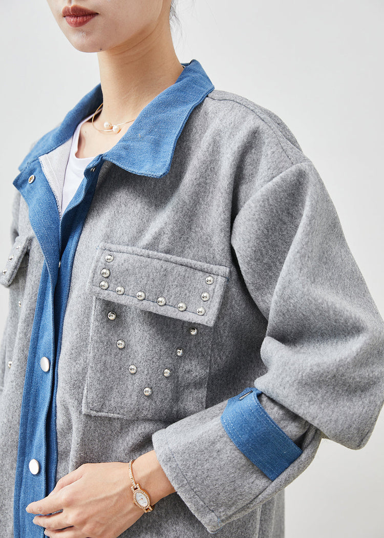 Art Grey Oversized Patchwork Rivet Woolen Jacket Spring