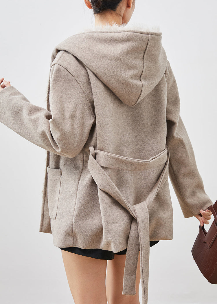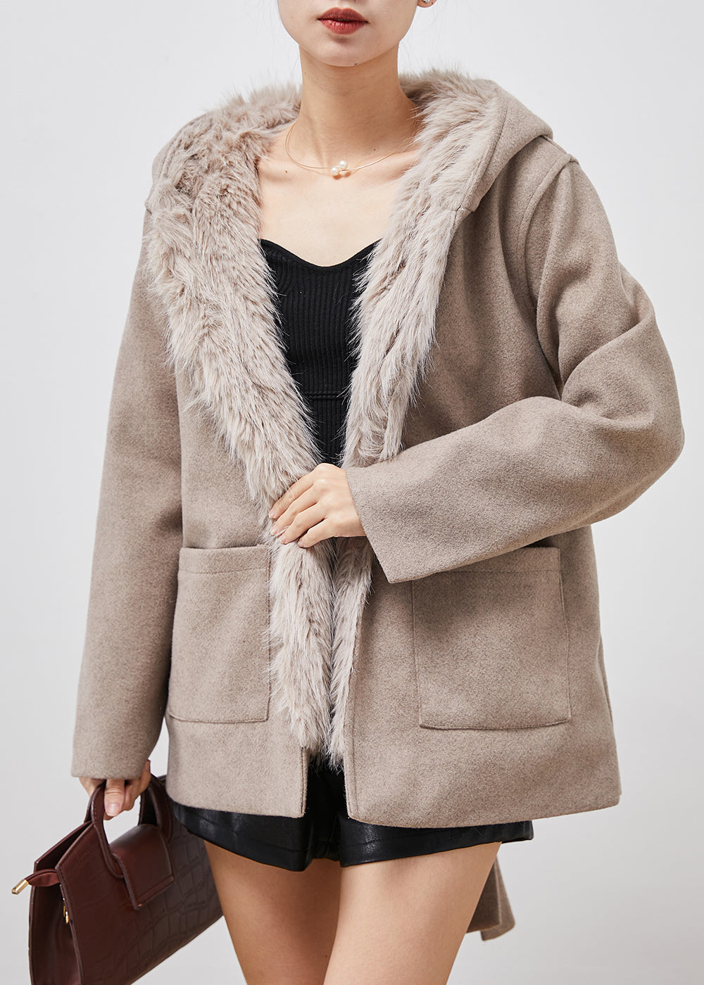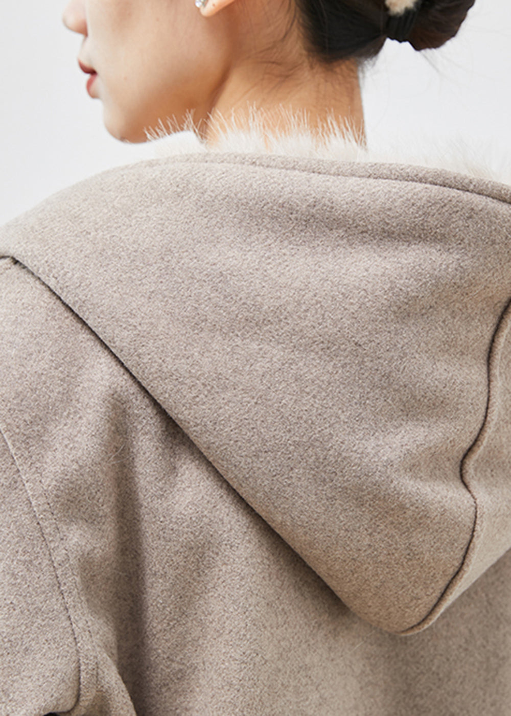 Simple Khaki Hooded Pockets Woolen Coat Fuzzy Fox Lined Winter