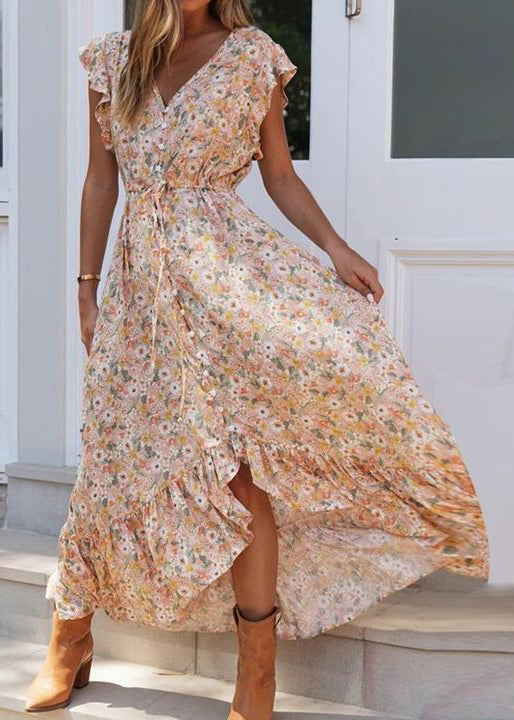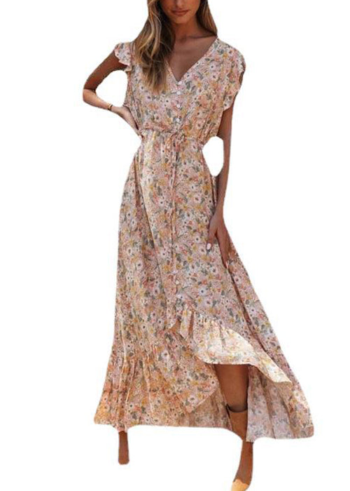 New Ruffled Lace Up Print Chiffon Dresses Summer