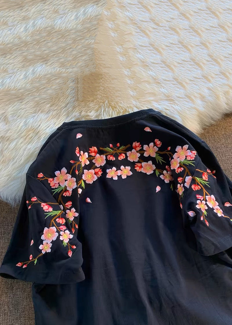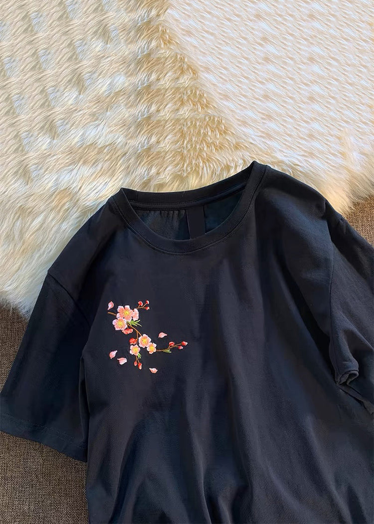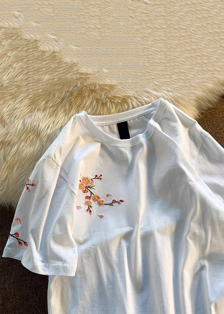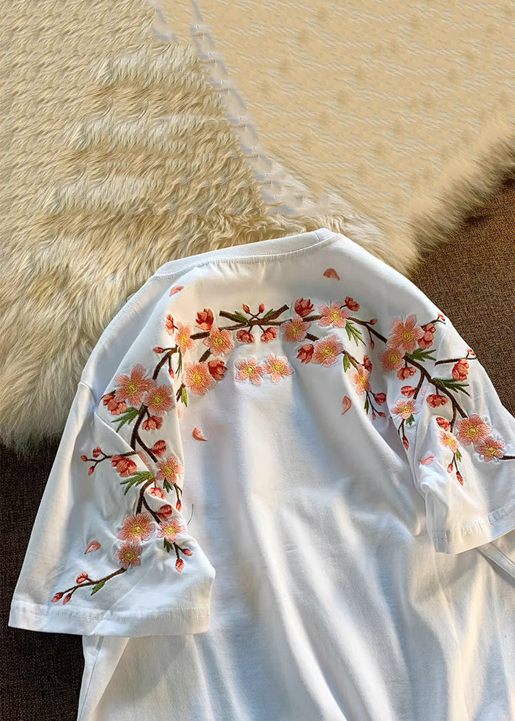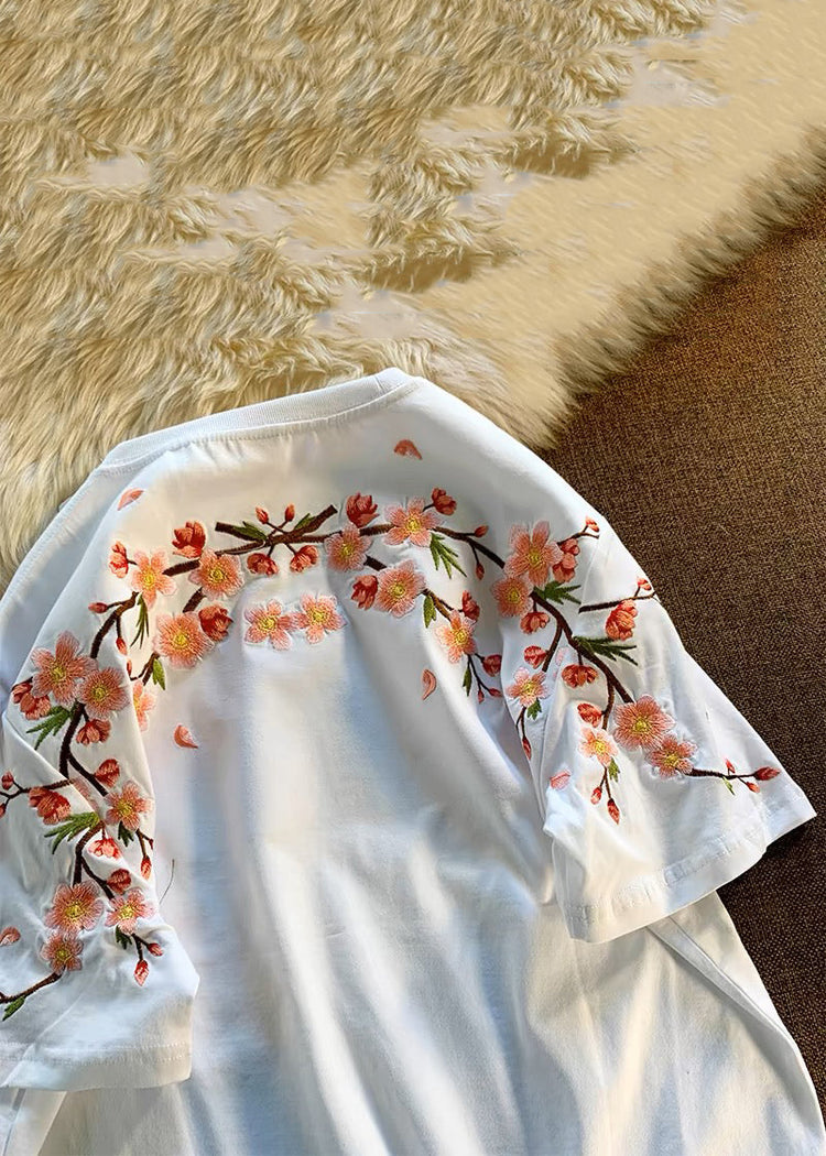 Loose White O-Neck Embroidered Cotton T Shirts Summer