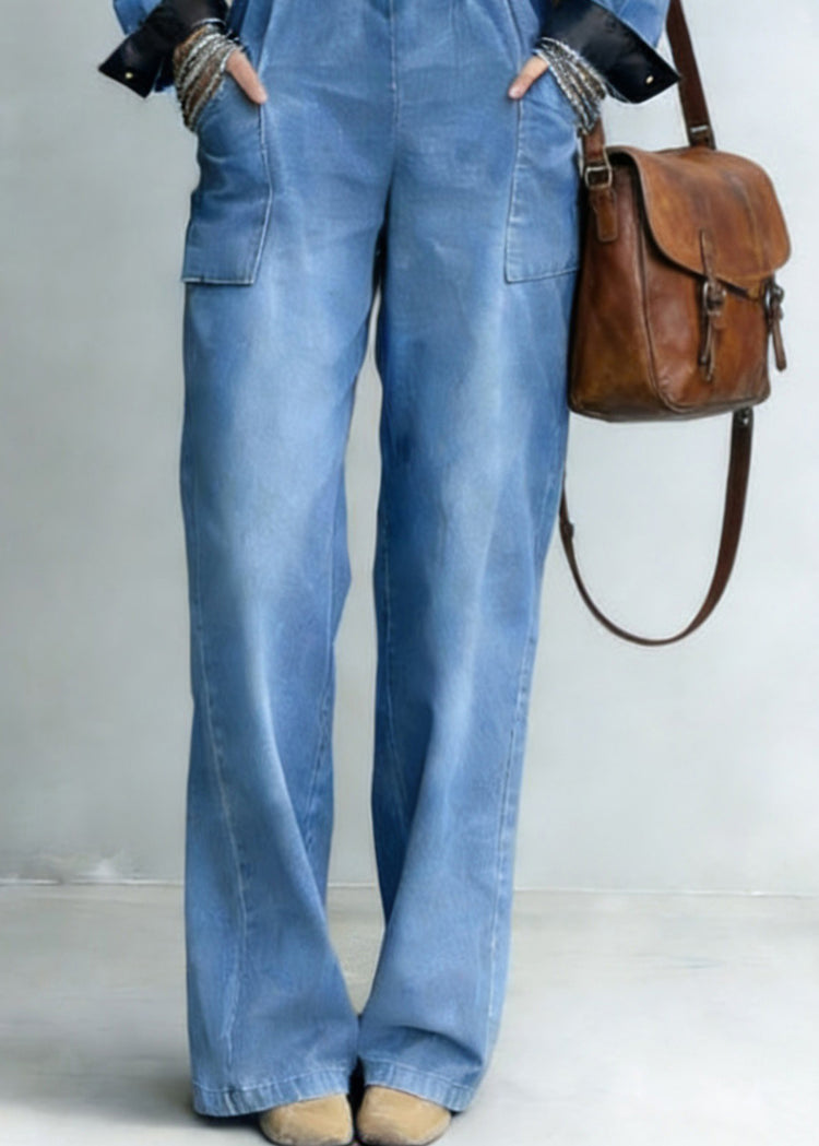Handmade Denim Blue Peter Pan Collar Patchwork Jumpsuit Spring