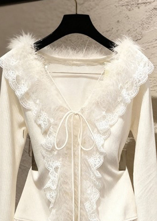 French Apricot V Neck Lace Patchwork Tie Lace Cotton Knit Sweater Spring
