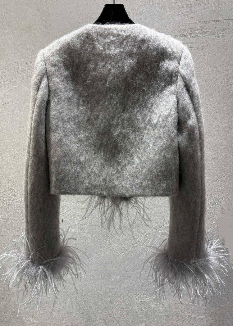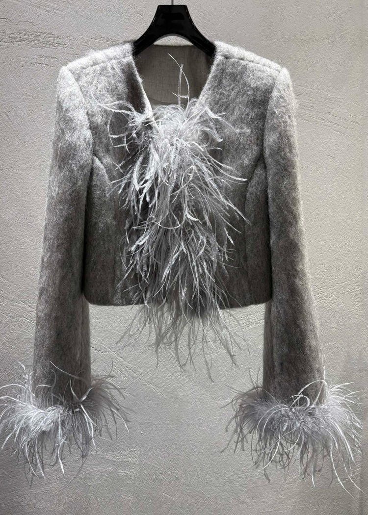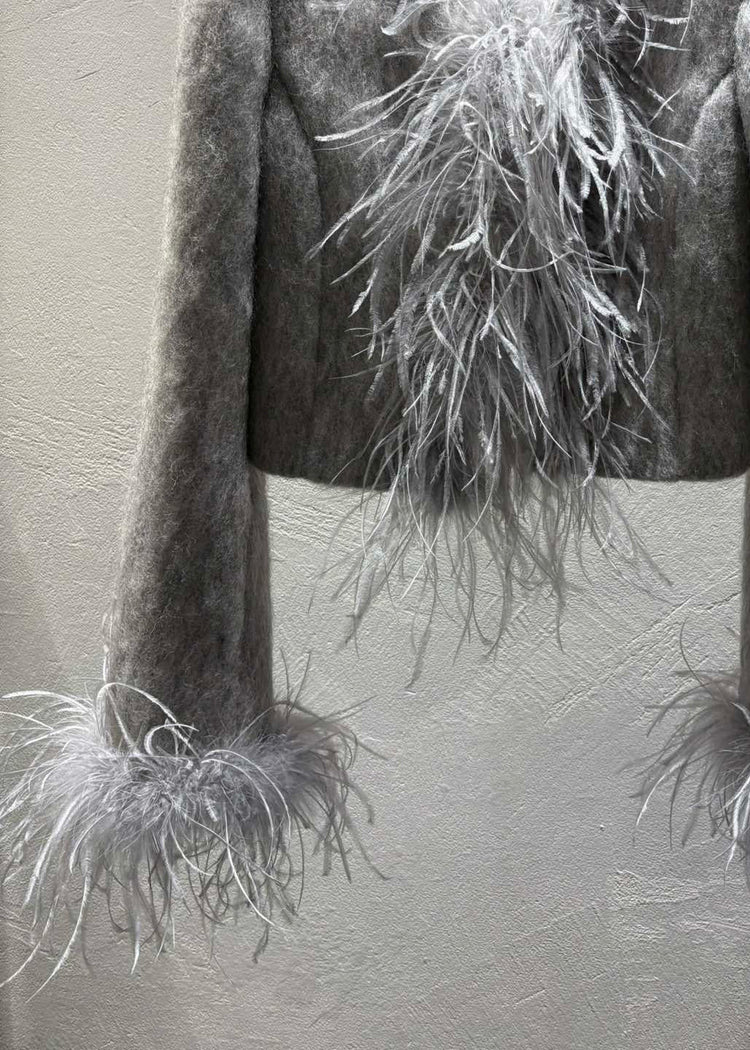 Fashion Grey Feather Patchwork Wool Coats Winter