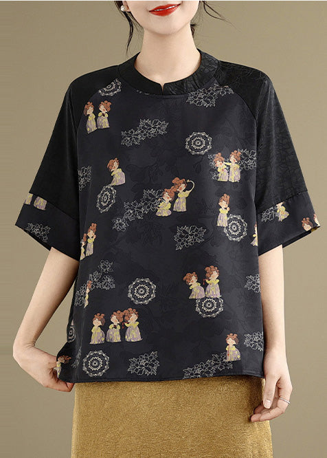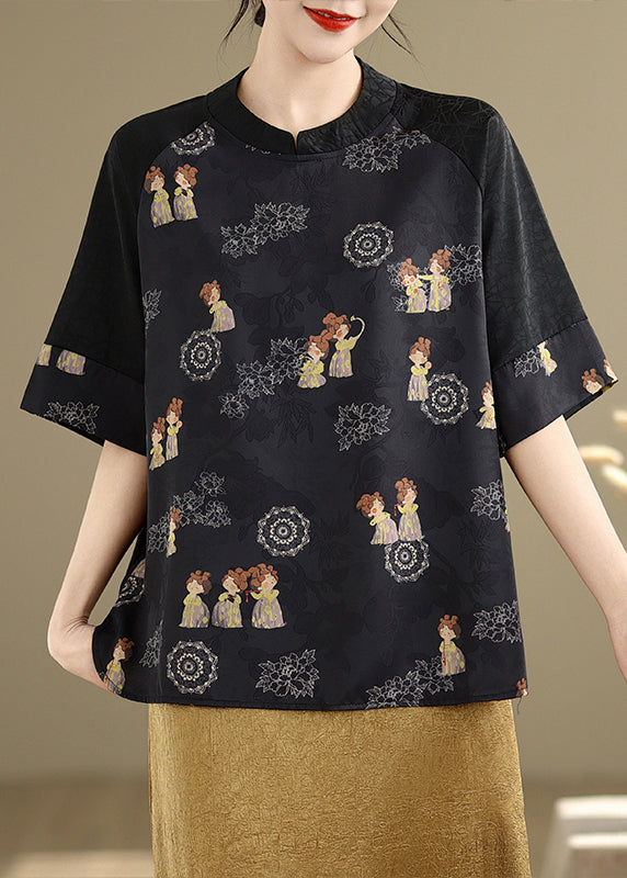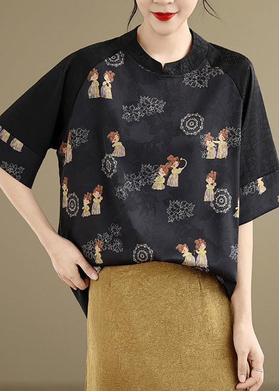 Retro Black Oversized Print Silk Blouse Tops Summer