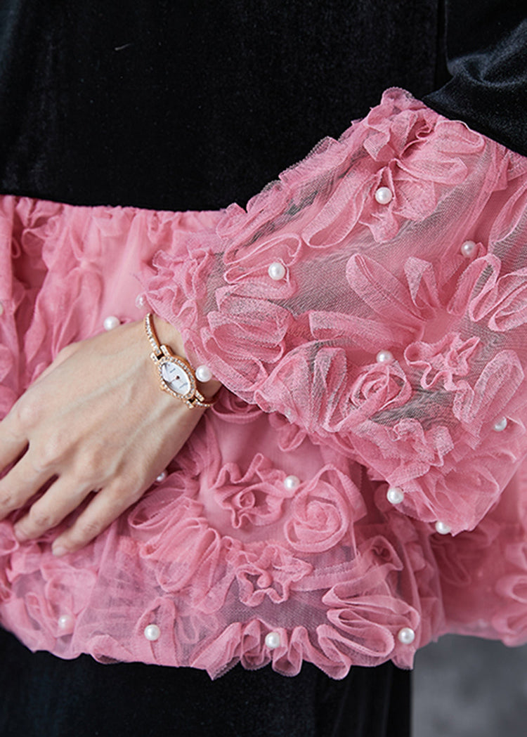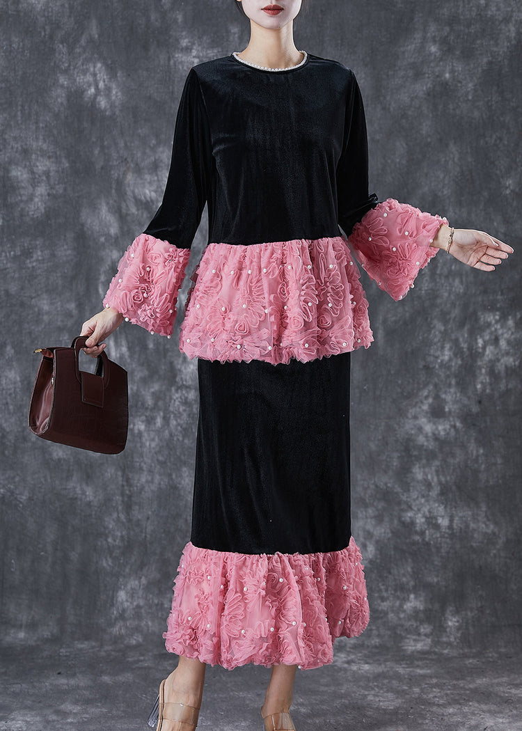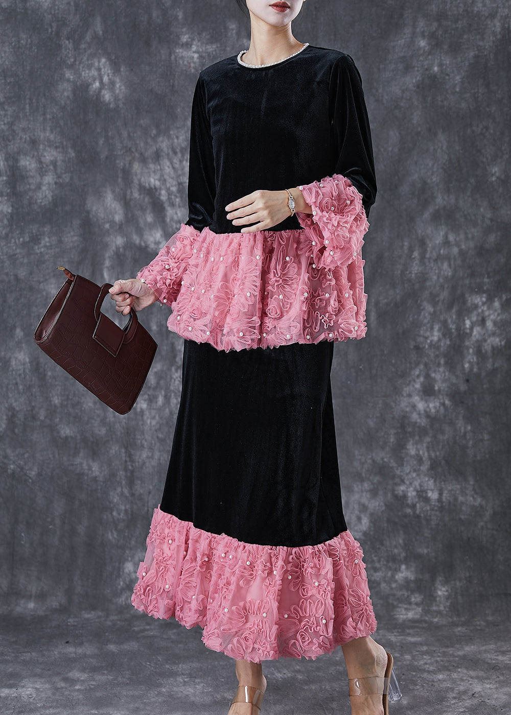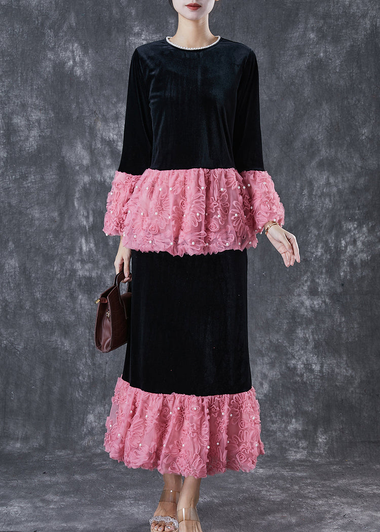 Art Black Ruffled Patchwork Nail Bead Silk Velour Two Pieces Set Spring