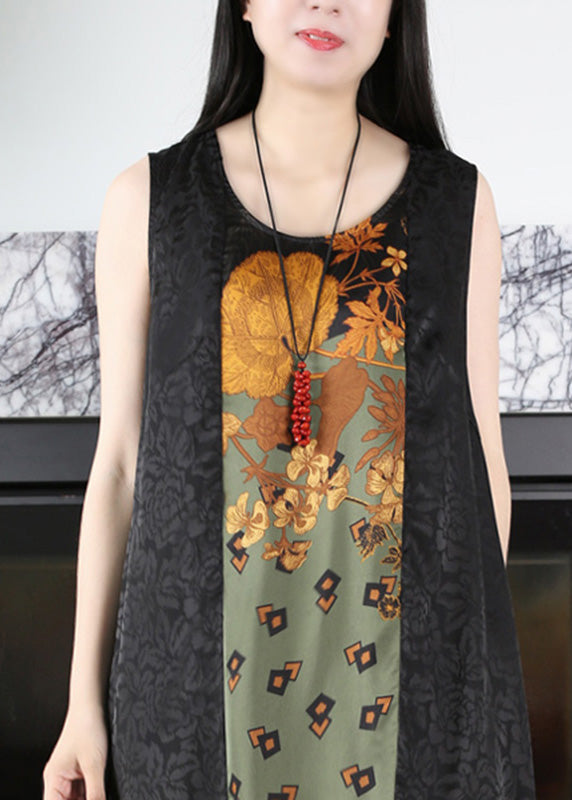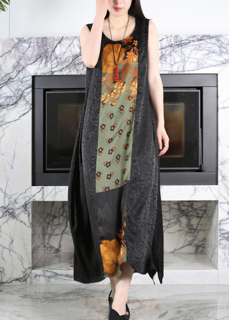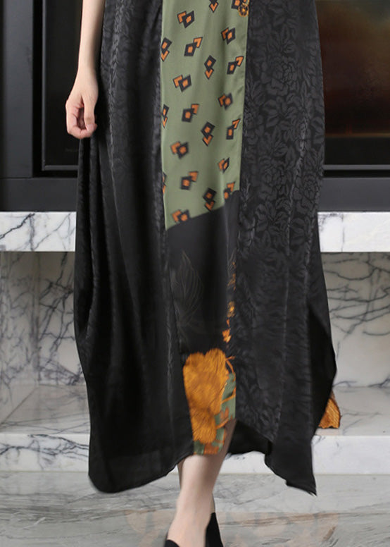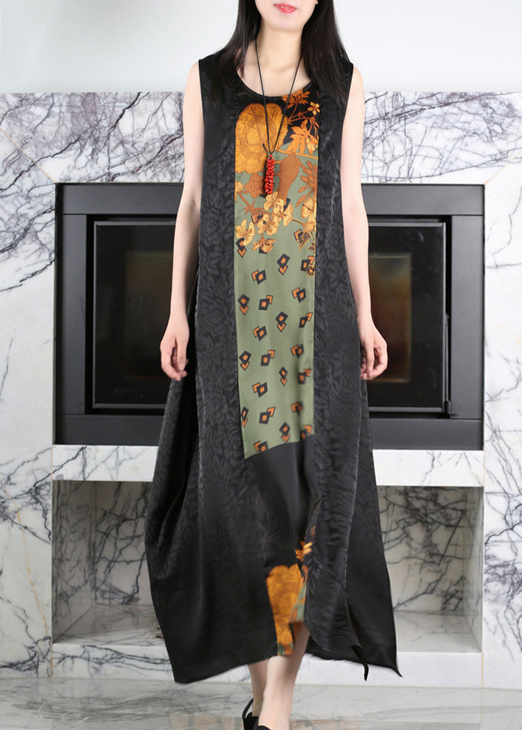 Casual Black O-Neck Print Side Open Silk Maxi Dress