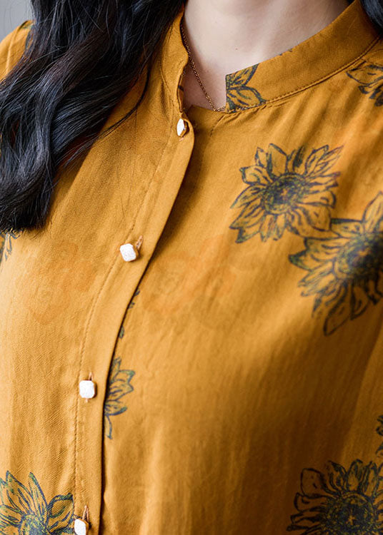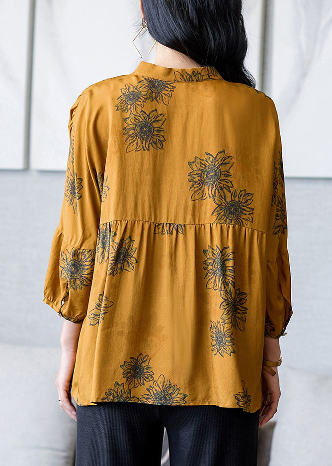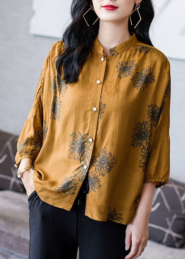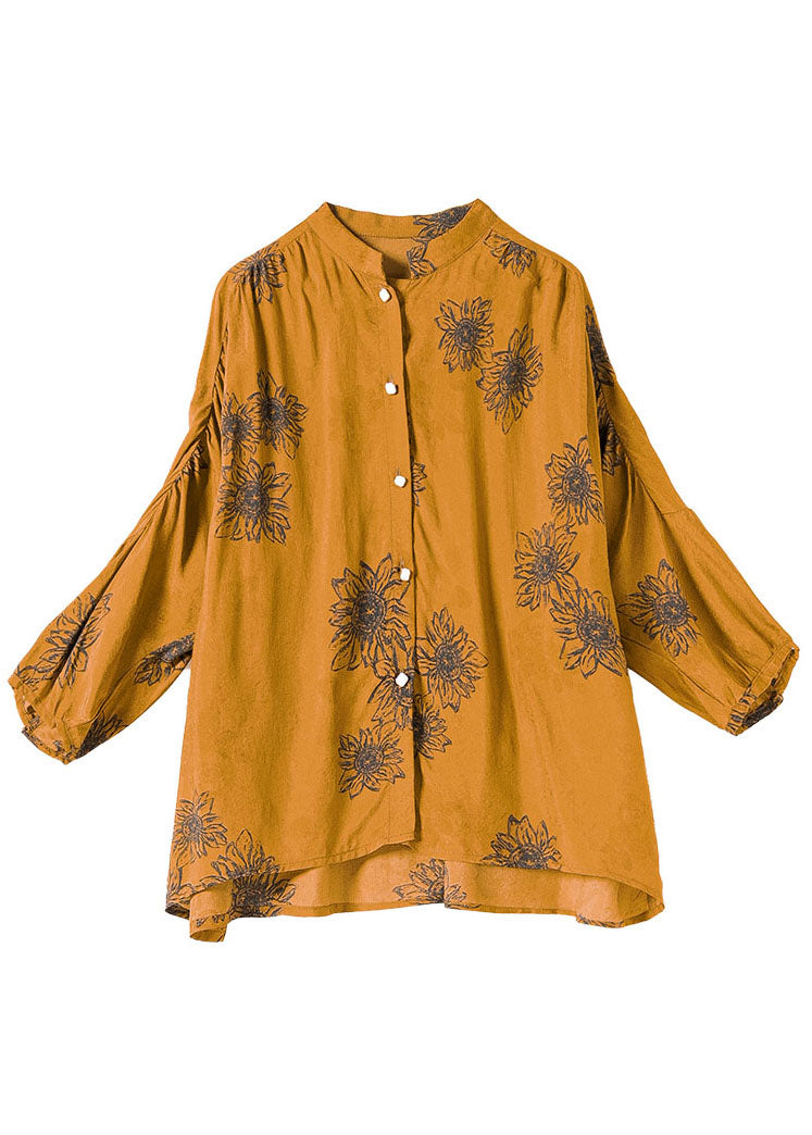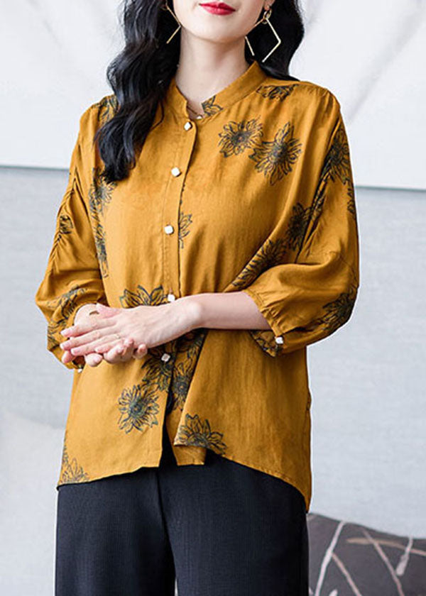 Casual Yellow Stand Collar Wrinkled Patchwork Print Silk Shirt Top Bracelet Sleeve