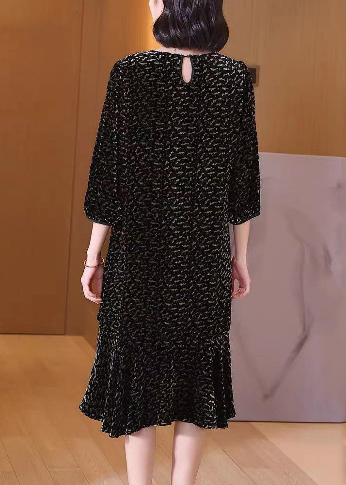 Italian Black O Neck Print Silk Velour Dress Bracelet Sleeve
