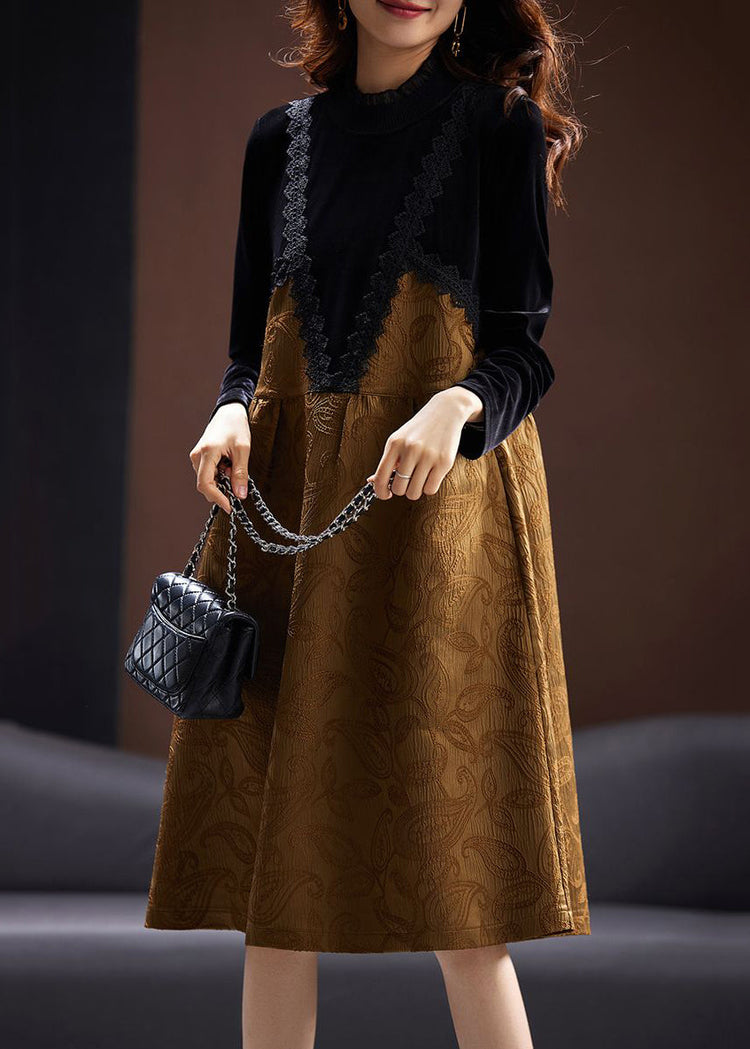 Jacquard Khaki Lace Patchwork False Two Pieces Silk Velour Dresses Spring