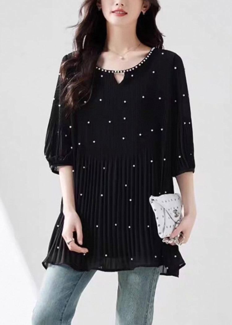 Modern Black O-Neck Nail Bead Silk Top Half Sleeve