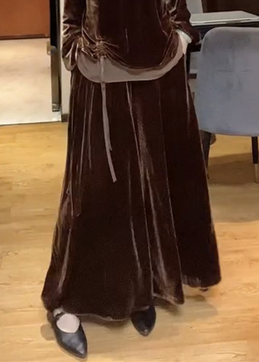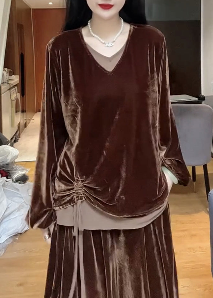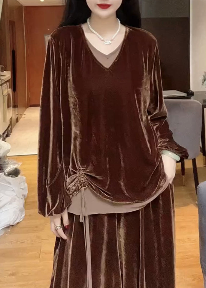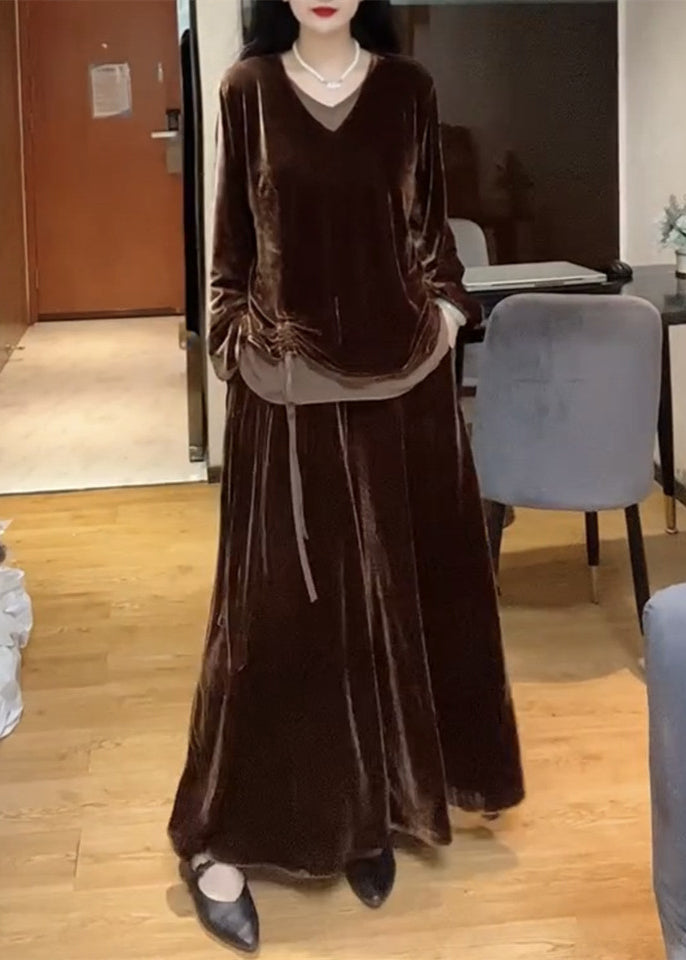 New Coffee Lace Up Pockets Patchwork Silk Velour Two Pieces SetSpring