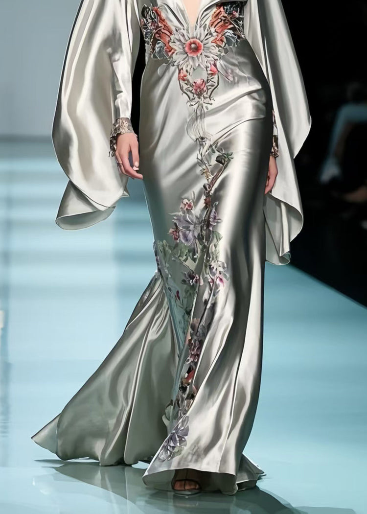 Original Design Grey Deep-V Neck Print Silk Party Dresses Batwing Sleeve