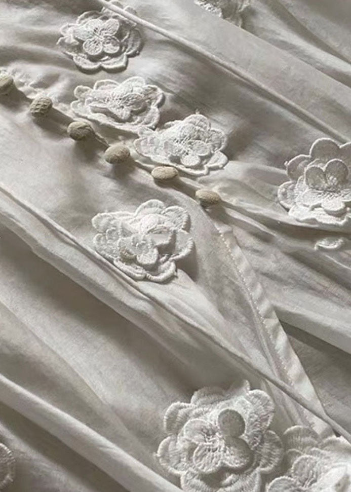 Style White V Neck Floral Decorated Patchwork Silk Top Long Sleeve