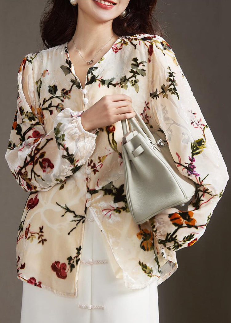 Women Apricot V Neck Button Print Silk Velour Shirt Spring