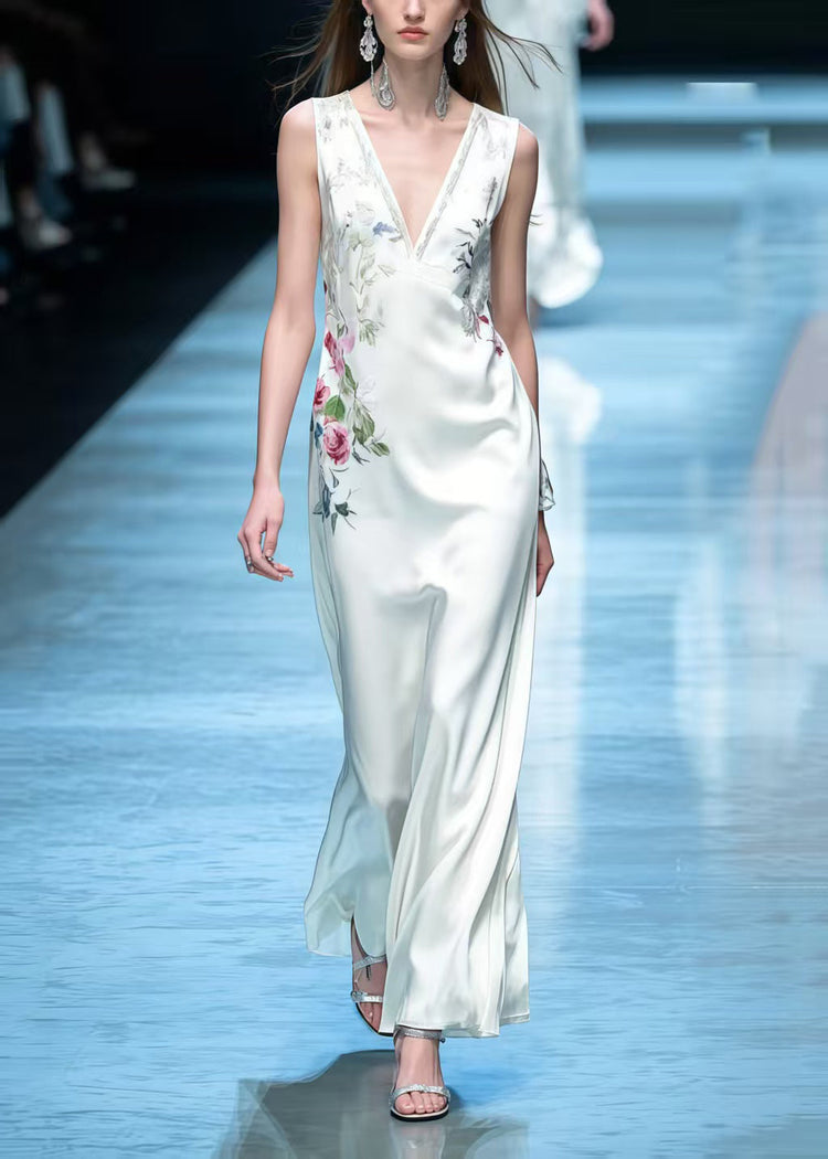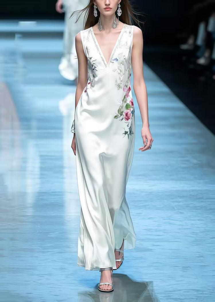 Women White V Neck Floral Silk Straight Dress Sleeveless