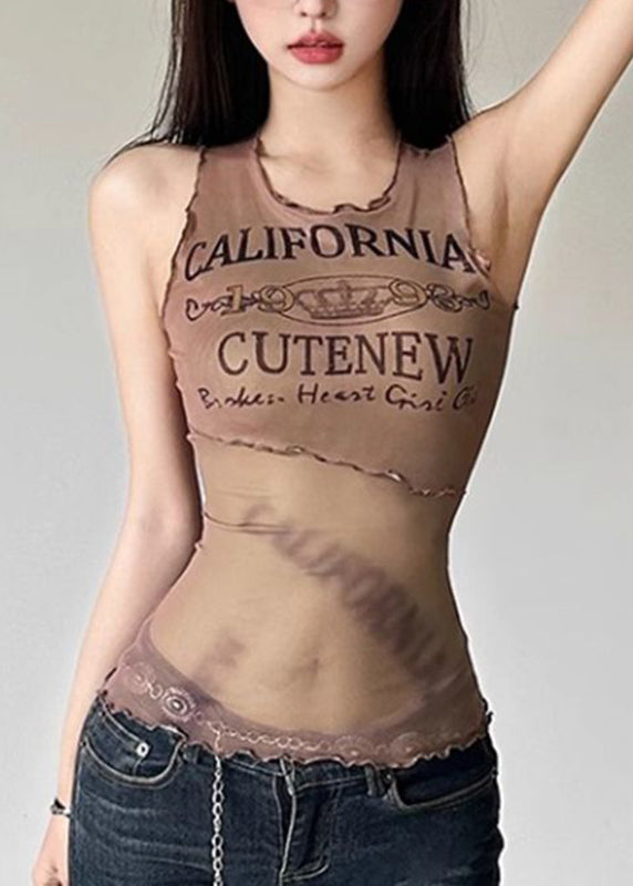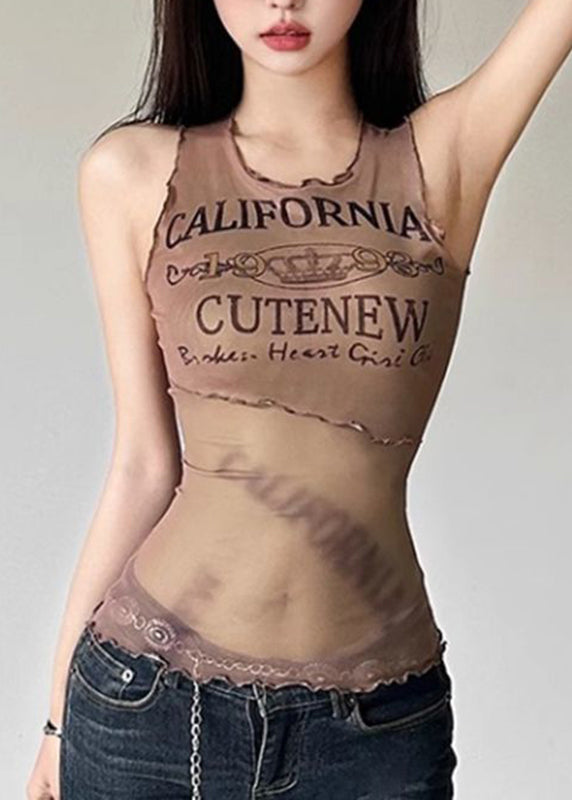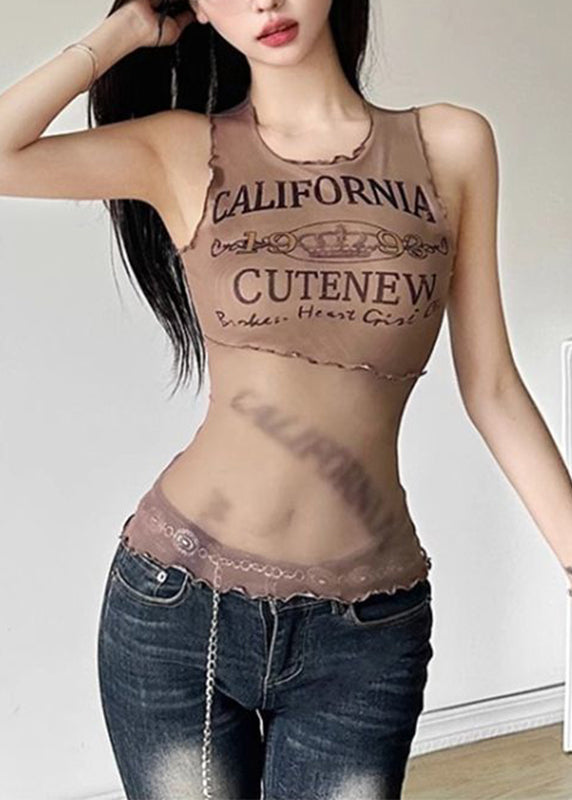 Fitted Coffee O-Neck Graphic Ruffled Tulle Tops Sleeveless