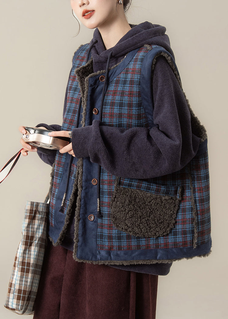 Casual Blue Plaid O-Neck Pockets Warm Faux Fur Waistcoat Winter