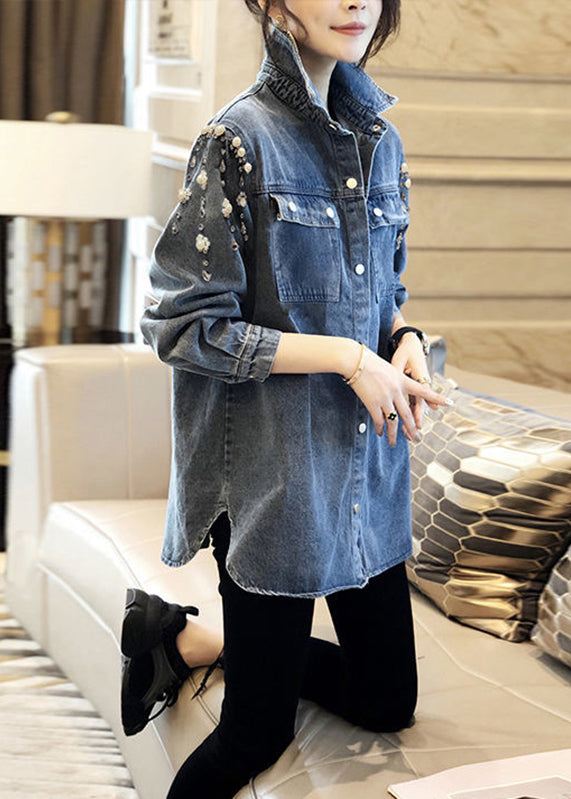 Handmade Blue Square Collar Pearl Patchwork Denim Coats Long Sleeve