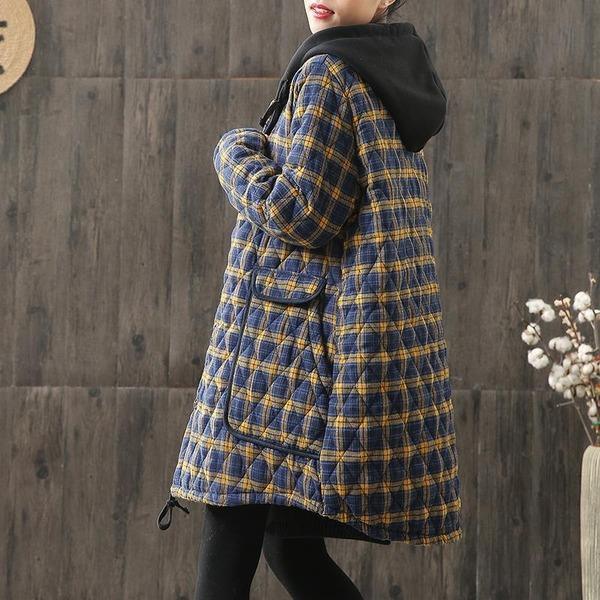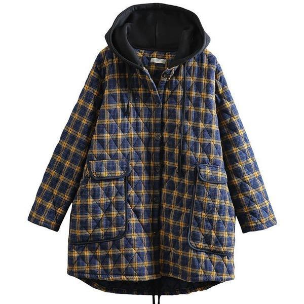 Hooded Plaid Parkas Vintage Button Coats Loose 2020 Pockets Female Casual Warm Parkas Coats - Omychic