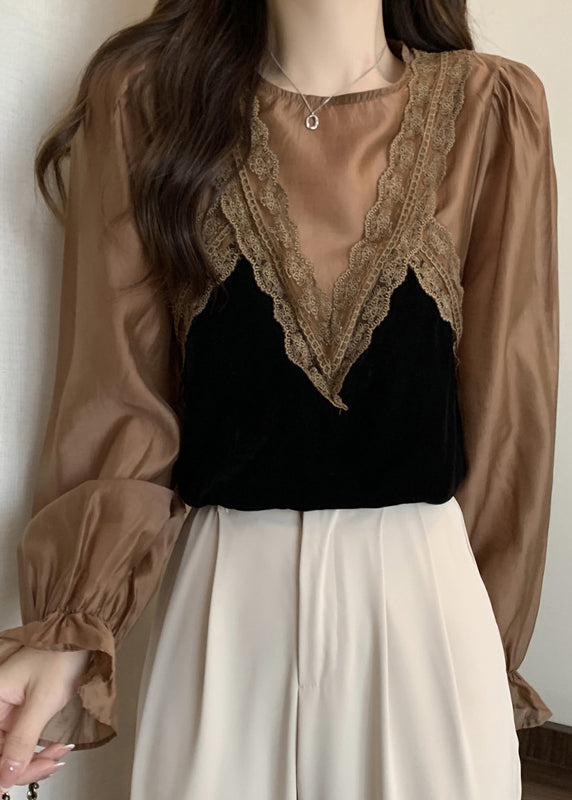 Classy Camel Ruffled Lace Patchwork Cotton Tops Fall